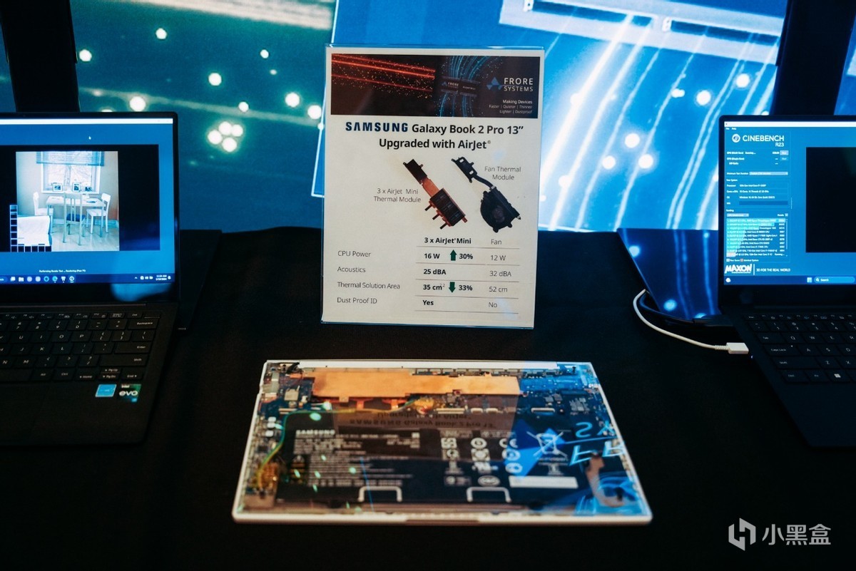 另外一个就是前面提到的轻薄本散热方案。在现场FRORE SYSTEM用三星Galaxy Book 2 Pro 13举例,同样的散热模组可以替换成3组AirJet Mini,从而可以让CPU效能提升30%,散热面积缩小33%,同时还能让笔记本的散热模组具备更好的防尘设计。