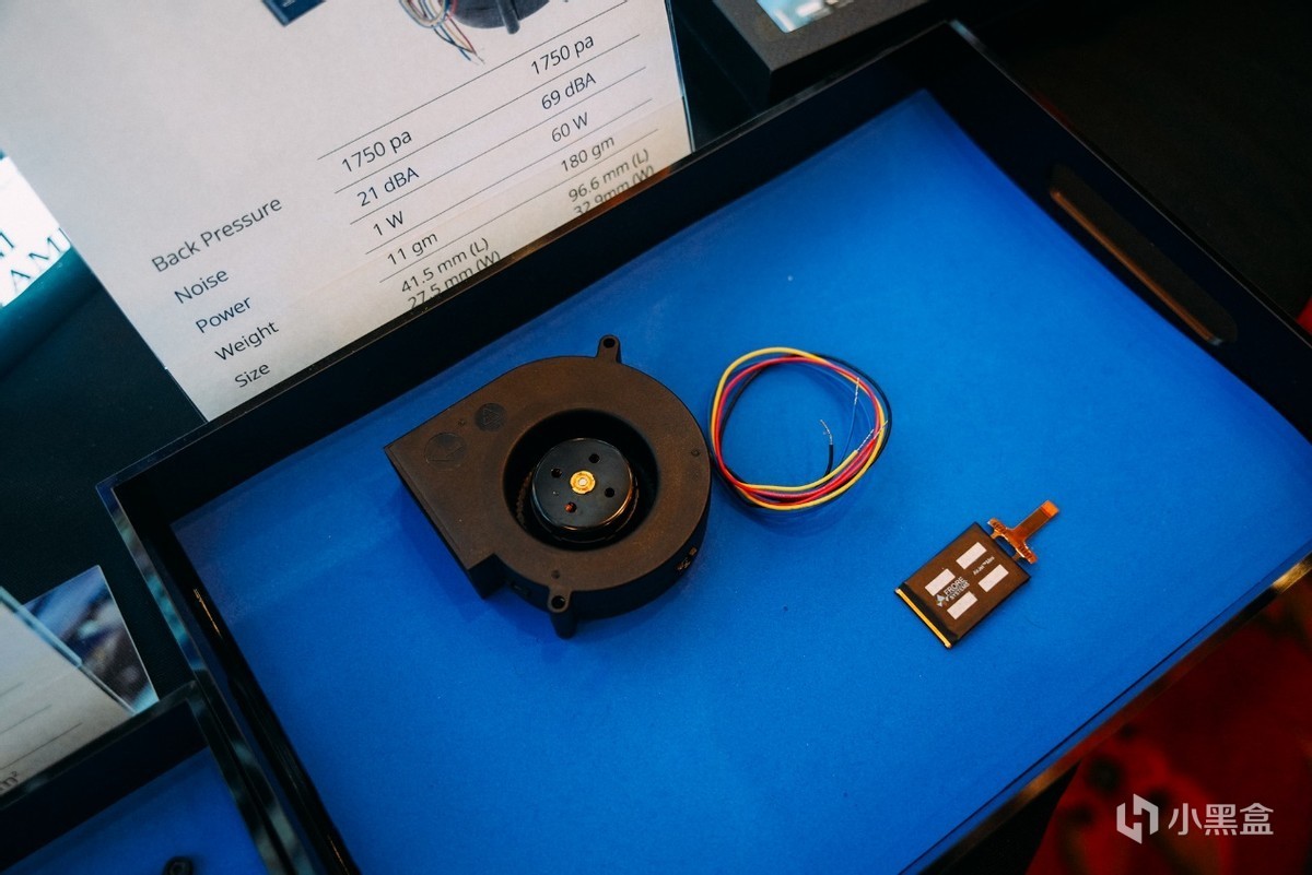 在现场FRORE SYSTEM也不忘用传统的散热器进行比较。比如可以同样产生1750 Pascals背压前提下,AirJet Mini可以做到1W最大功耗和21 dBA噪音,厚度仅有2.8mm。相比之下,能产生1750 Pascals背压的大块头抽风机不仅不可能塞入笔记本,同时还需要60W功耗,以及产生69dBA的噪音,高下立判。