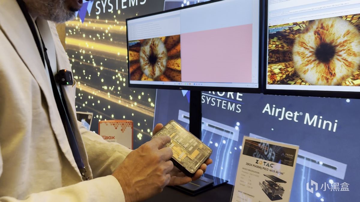 事实上,已经有量产产品开始使用AirJet Mini了。在DEMO房间内,我们看到了一款来自索泰的ZBOX pico PI430AJ with AirJet Mini PC,这是一款搭配了Core i3-N300处理器、LPDDR5内存的产品,处理器上方覆盖了一个大面积铜板,并搭配2个AirJet Mini,从而实现散热效果。
