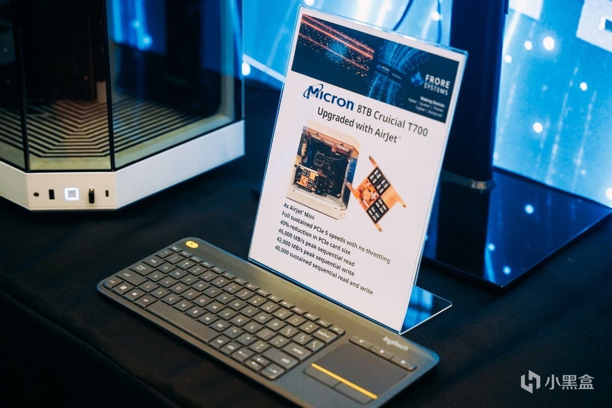 有意思的是,AirJet Mini甚至在数据中心也能起到很好的作用,现场DEMO展示使用了一块8TB的Cruicial T700 PCIe 5.0企业级SSD做展示,在长时间负载下,性能已然可以保持45000MB/s和42000MB/s的顺序读写速度。AirJet Mini可以帮助企业级固态硬盘占用更小的服务器空间。