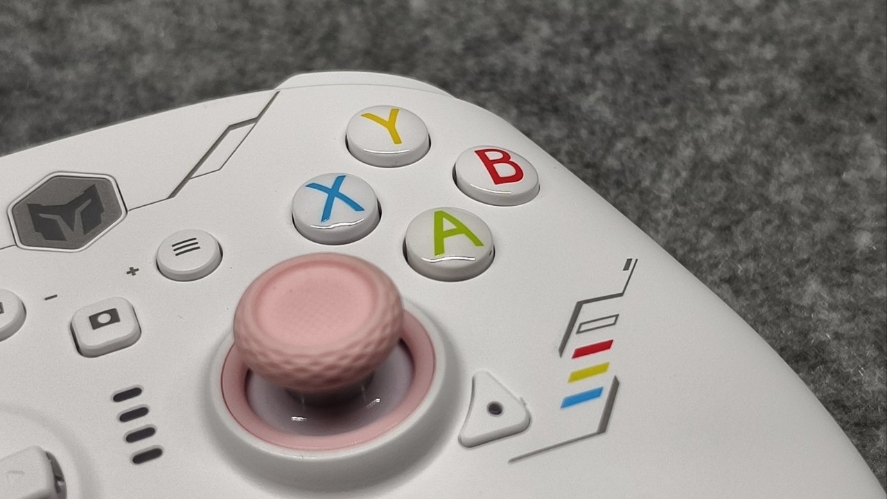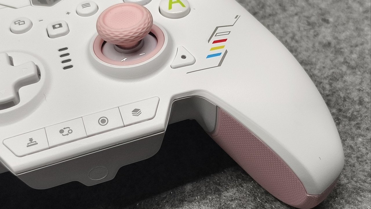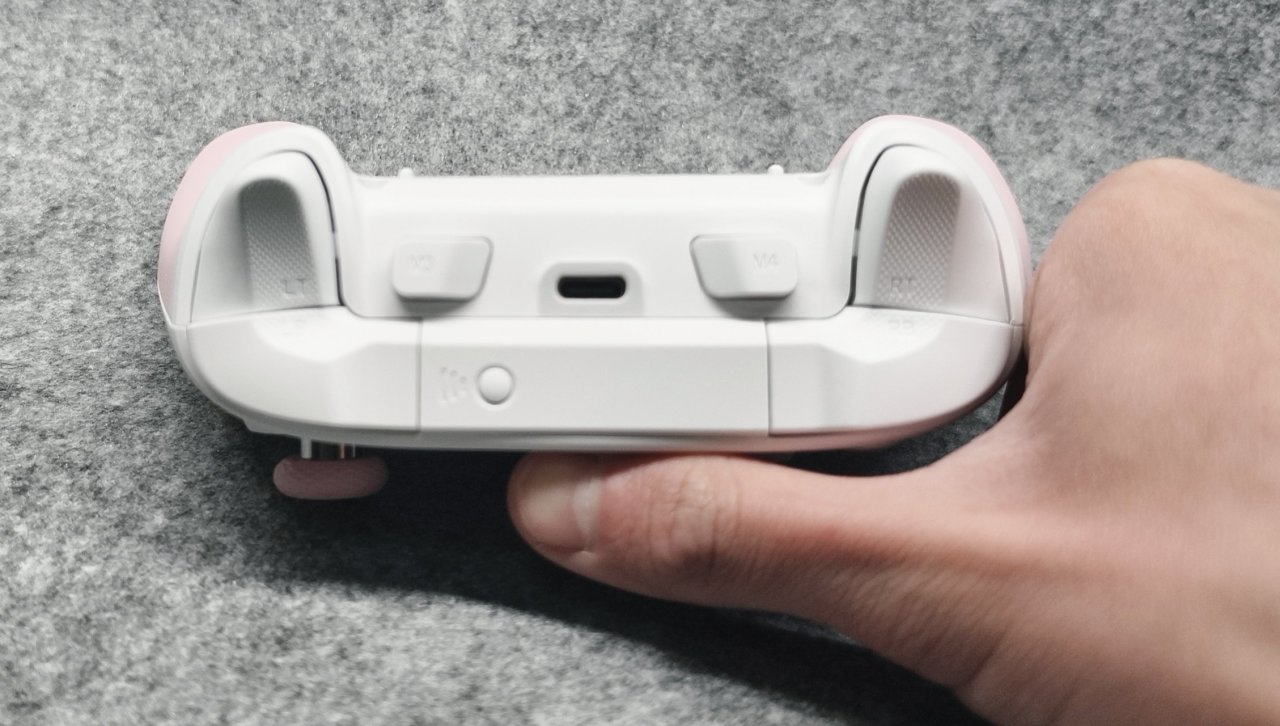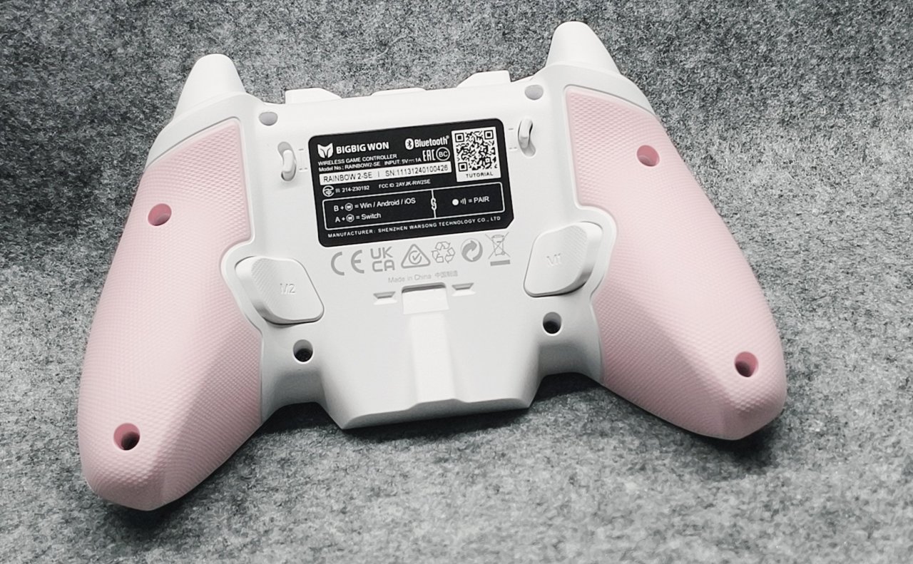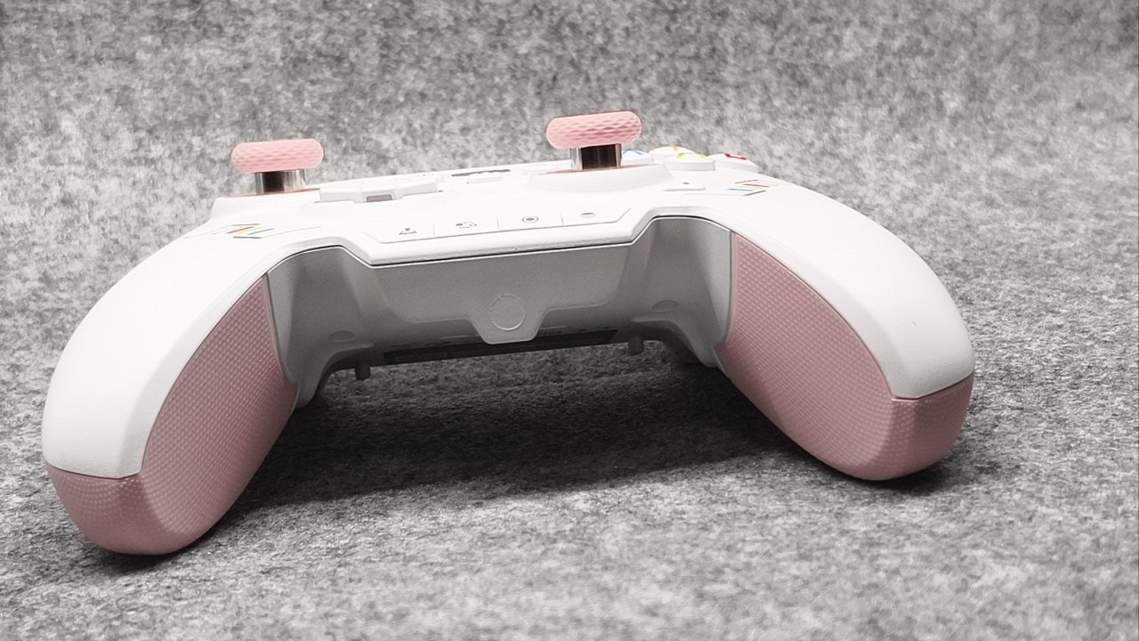手柄的背部则有两个背键,算是现在手柄的标配了,对于打一些按键较多的游戏使用起来还是挺舒服的,平日里如果喜欢打格斗游戏,也可以对背部设一个手柄宏,直接一键连招。可能是为了配合整体的配色,它的防滑纹是做了粉色的处理,整体的纹理感也较强,适合平日里手汗较多的玩家。