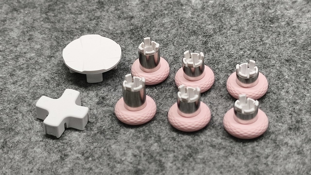 并且值得一提的是它的摇杆帽共有六对(加上本身的),摇杆帽上还特意做了防滑纹的处理,日常使用也不用害怕打滑,墨将看来还是挺细心的。除了摇杆外他还多一个八向十字键可以替换,十字键在手感是较为轻的,按压起来较为舒适且清脆。