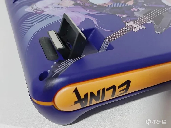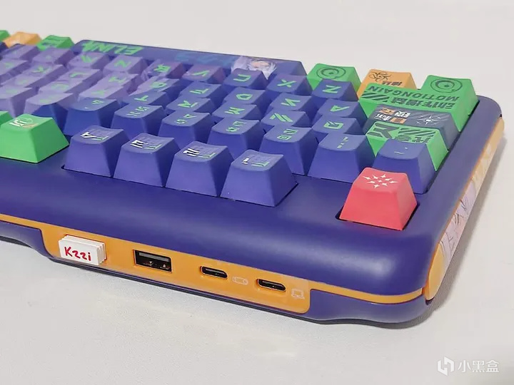键盘边框四周采用与紫色对比色强烈的黄颜色搭配,左后方设有1A+2C接口,有线模式使用时可以充当hub;另外还有接收器磁吸收纳仓,2.4G无线接收器放在里面不易丢失,非常方便;