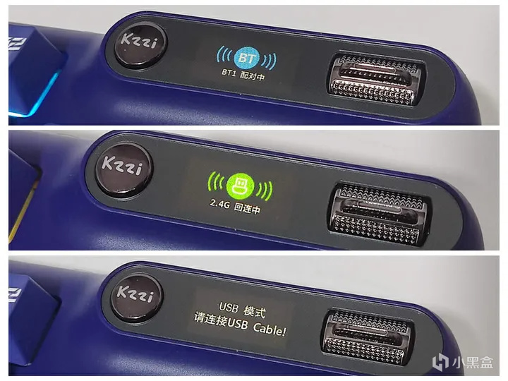 想要切换珂芝Z98的三种连接方式,无需使用繁琐的FN+组合键操作,只需通过上下拨杆、logo键确认和屏幕显示的方式来切换,非常直观和方便;