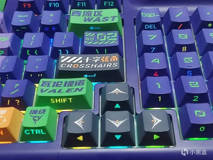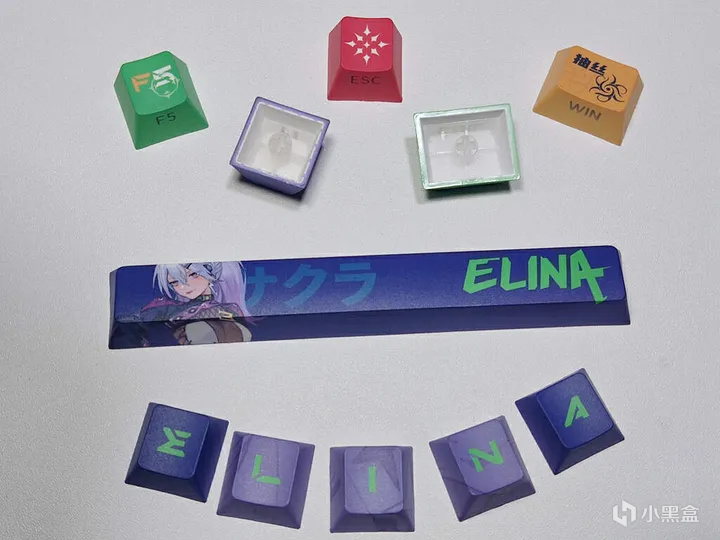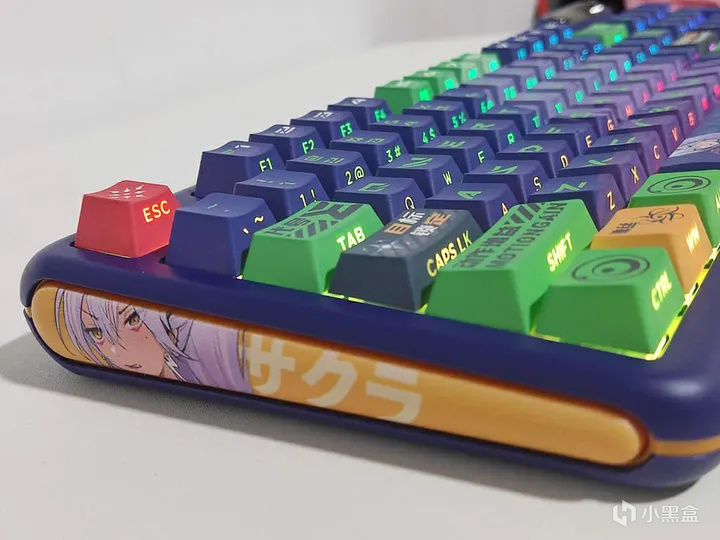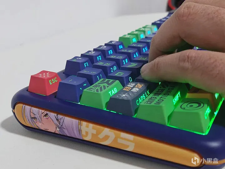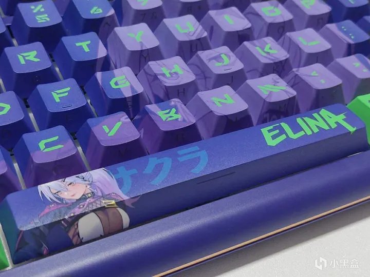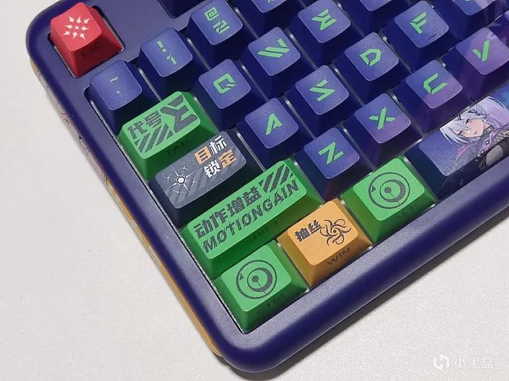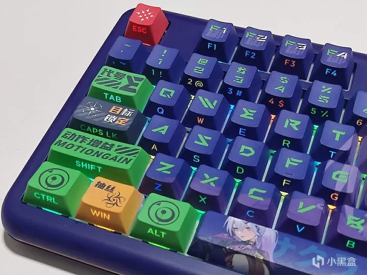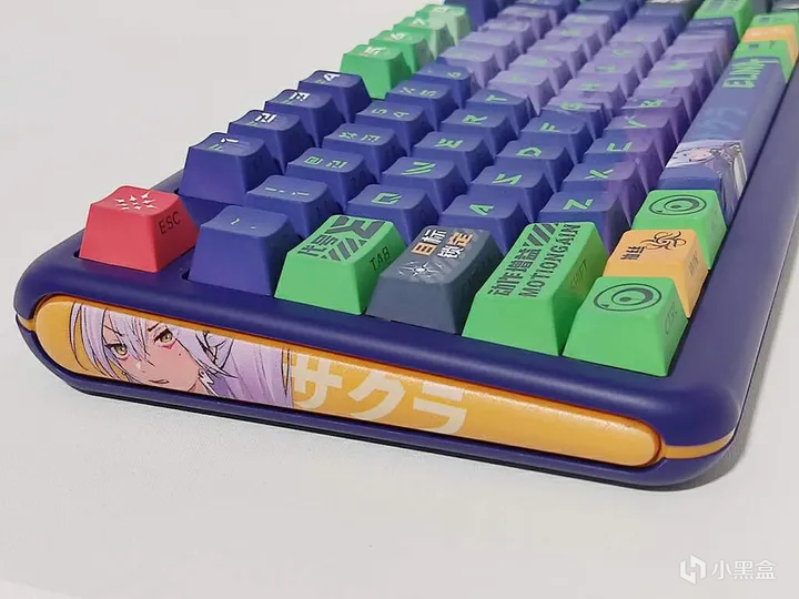 键帽做工很棒。人物、技能和字符都非常清晰,颜色还原度高。高含量PBT材质的键帽更加耐用,可以有效防止打油,加粗的字体看起来更加清晰、二次元感满满;