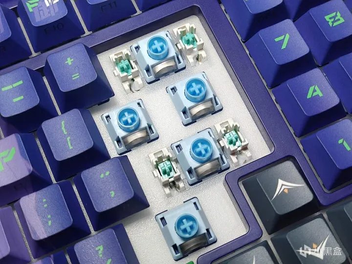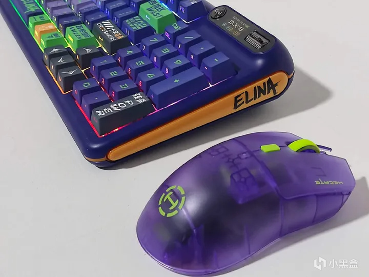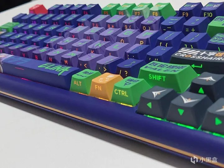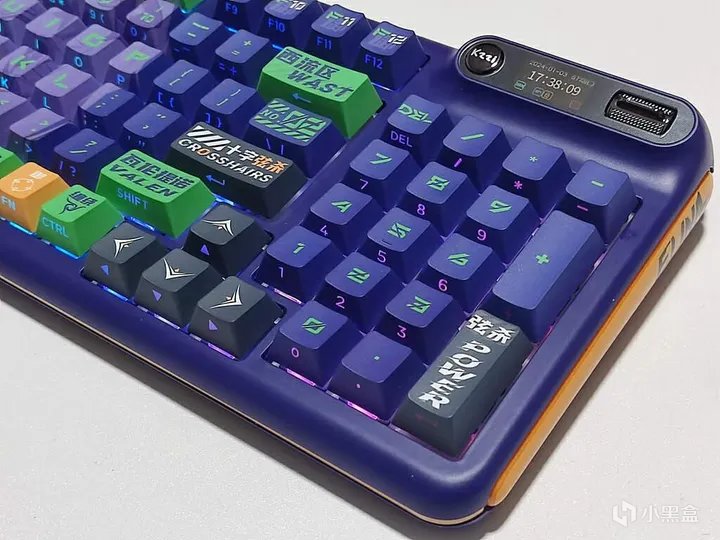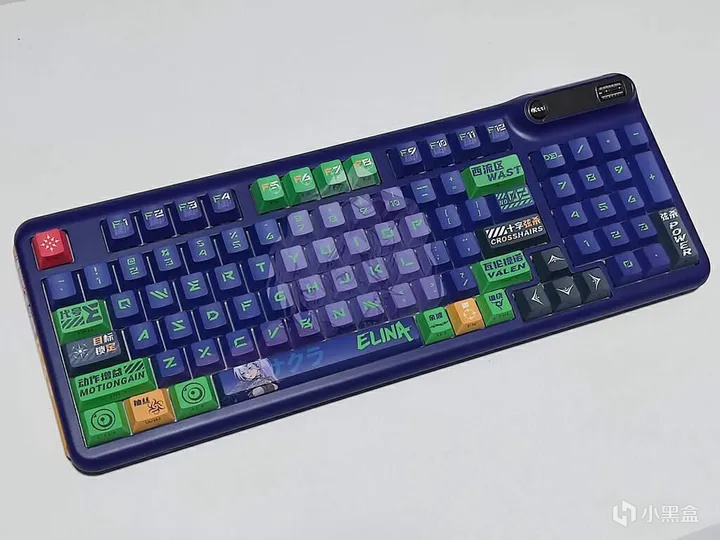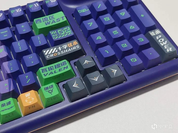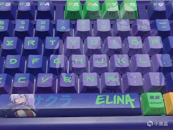 珂芝Z98 IP定制款全键采用五面热升华、PBT材质、二次成形、原厂高度的侧透键帽。这套键帽能非常好且全面地展现出目前量产键帽的工艺水平。Elina 定制款的键帽整体为紫色+绿色字符,搭配部分绿色、黄色、灰色和红色的个性键帽,