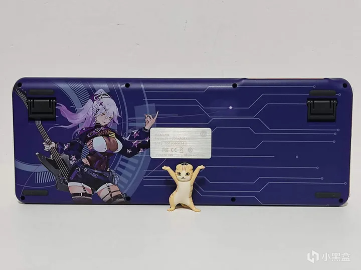 键盘背面设有四枚防滑垫、一对脚撑以及一块金属铭牌;