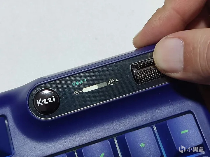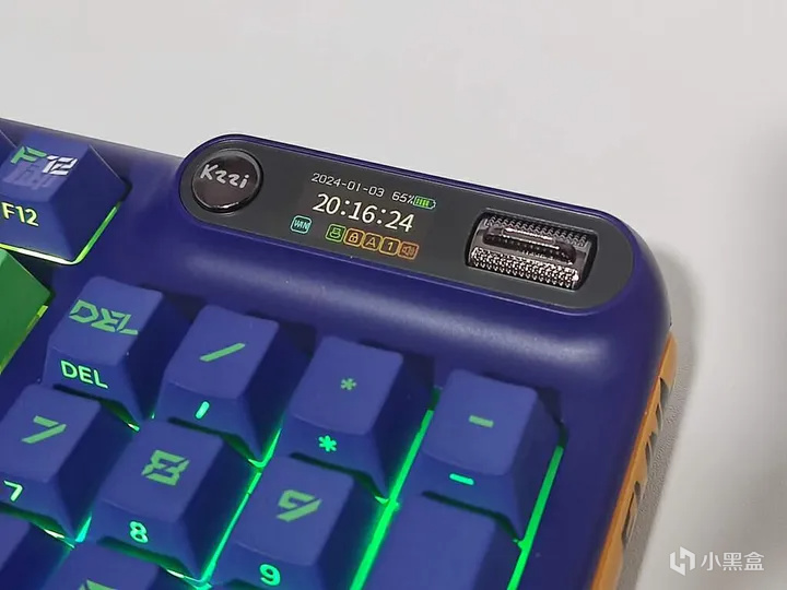 右上角的智能交互彩屏是珂芝Z98最大的特色,除了可以显示时间日期、开机动画、连接方式、电量等信息,通过logo按钮(开关机/确认)和拨杆(移动),与屏幕形成交互,可以实现调节音量、切换三模、设置灯效等各种丰富功能;