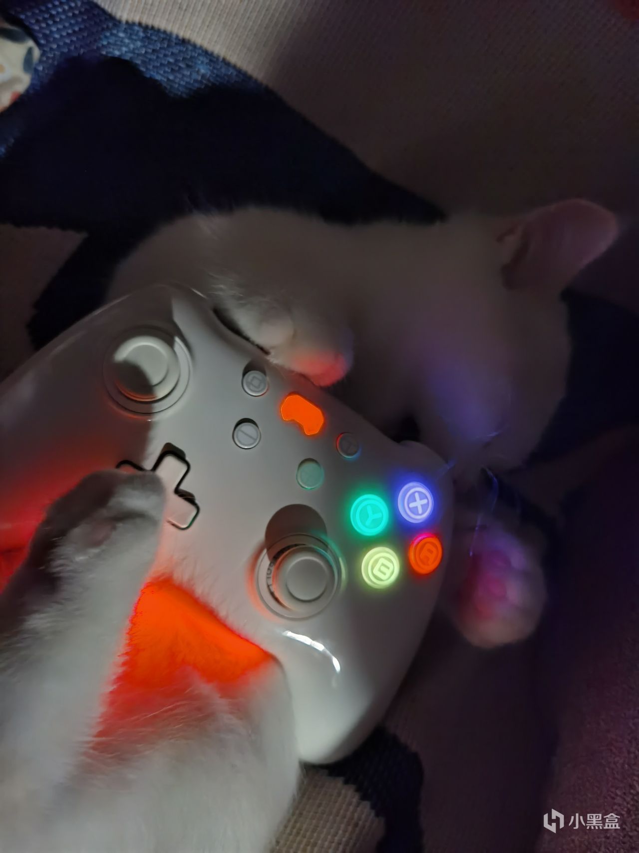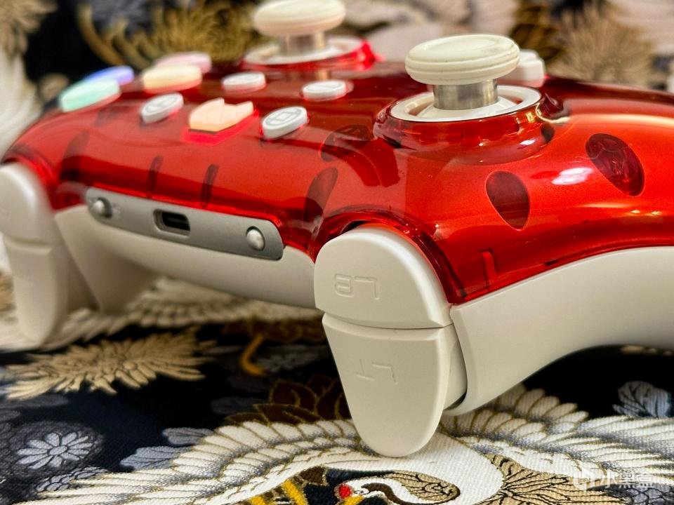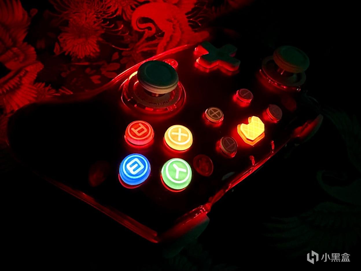 手柄还自带RGB灯效,可以通过按住T键和左摇杆替换颜色,同时通过T键和+-号键位进行控制亮度,即使在黑暗的环境下也能分辨的出来键位的方向,中间的亮灯就是logo,如果有玩玩桌搭的盒友也适合入手。