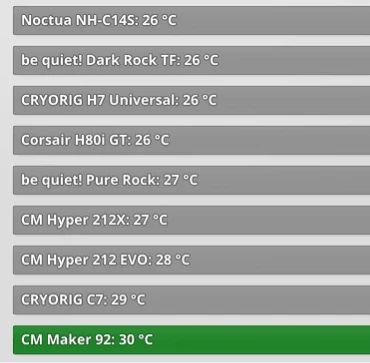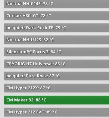 Maker92比酷冷自家的入门级单塔Hyper 212 EVO略强,它们都在温度墙的边缘疯狂试探。更被猫头鹰的旗舰级下压散热器NH-C14S远远甩在了身后,二者有着高达10℃的温差!
