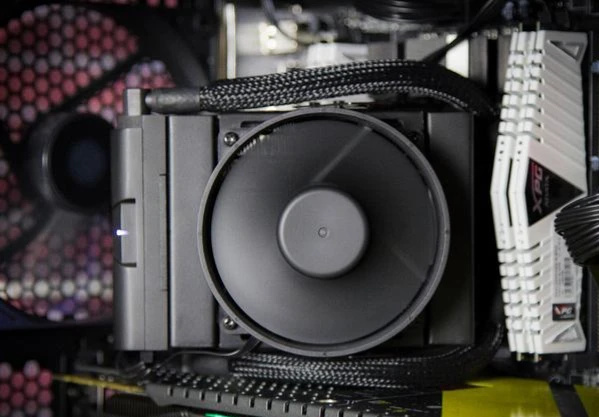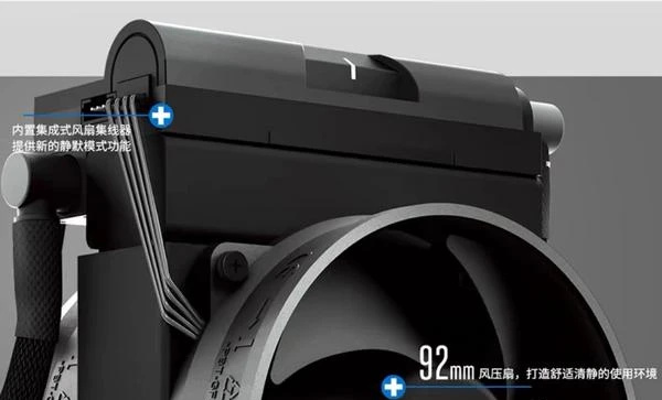 五片叶片弯曲成镰刀造型,显然是强调风压的设计。两把92mm风扇的转速可达2600RPM,并且支持PWM调速。
