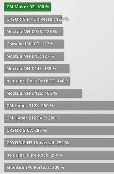 在TechPowerUp的测试中,Maker92的“性能/价格比”远低于所有参测风冷。在它面前,就连高傲的奥地利“猫头鹰”散热器,也称得上是“极具性价比”了。