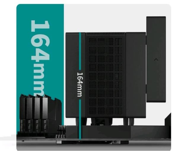 著名的高端风冷“猫头鹰”NH-D15S,其塔体高度也“仅有”160mm,哪怕是旗舰级的九州风神 阿萨辛IV,它的净高也都没有超过165mm——即便如此,也足已让不少MATX机箱合不上侧板了。