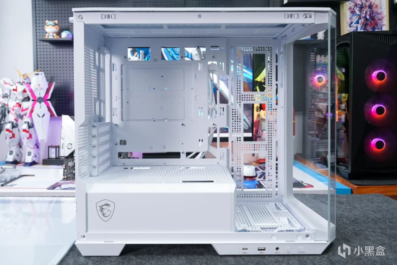 本文的第二位主角就是机箱——微星MAG PANO M100L PZ。该机箱也是微星的新品,主打就是支持背插+大尺寸无立柱侧透海景房设计。并且对比传统机箱方方正正的设计,该机箱采用了大量的不规则的切角设计,使得造型非常另类。尤其在大尺寸无立柱3块钢化玻璃侧透面板的加持下,可以实现270°的内部透视效果,全方位的展现机箱内部。