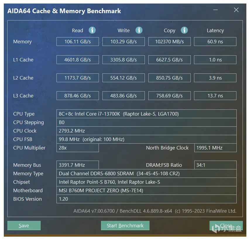 佰维WOOKONG DX100内存开启XMP的频率为6800MHz(34-45-45-108),通过AIDA64测试读取速度为106110MB/s,写入速度为103290MB/s,复制速度为102370MB/s,延迟为60.9ns。