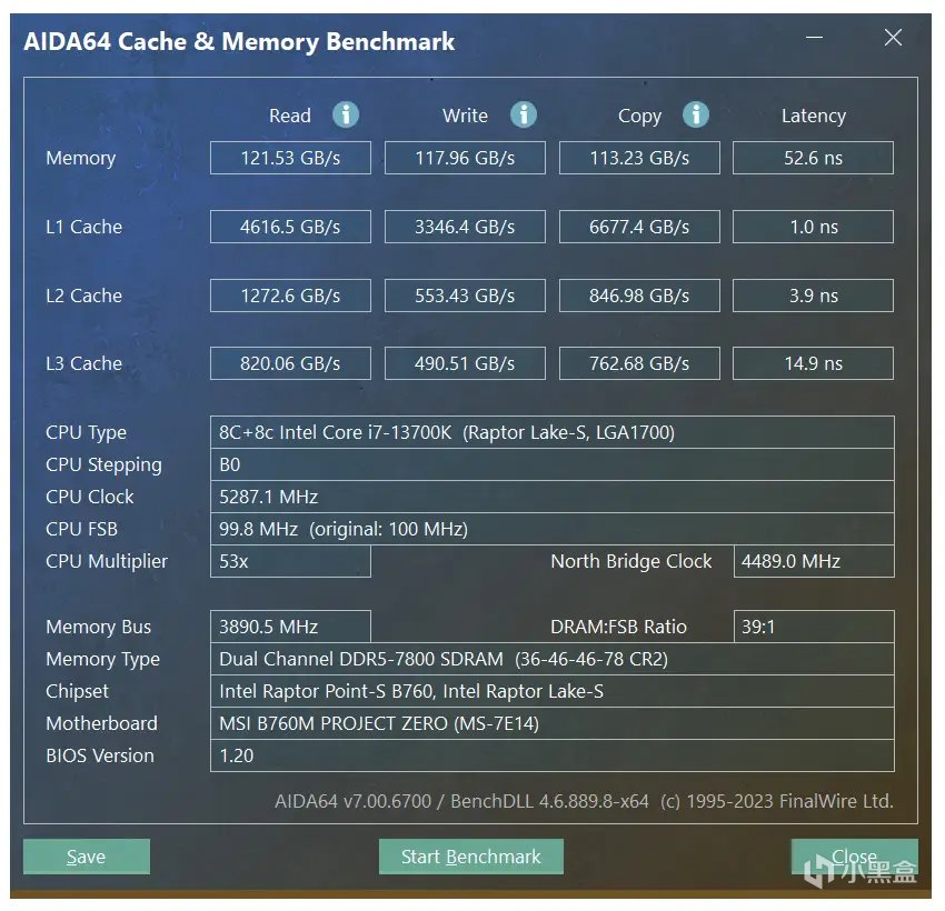 将内存超频到7800MHz(36-46-46-78),读取速度达到了121530MB/s、写入速度达到了117960MB/s,复制速度达到了113230MB/s,延迟为52.6ns。
