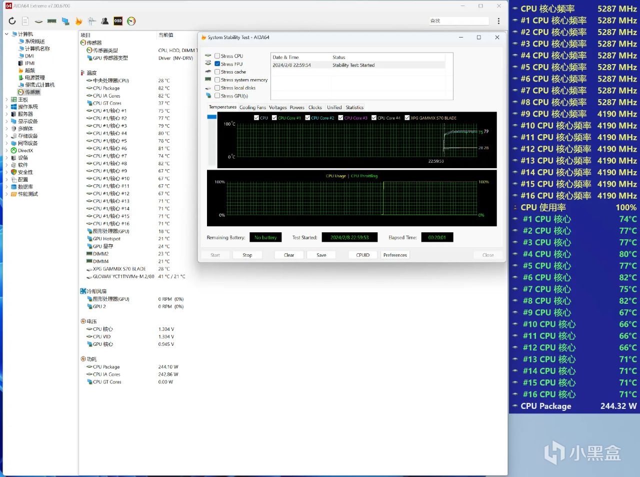 在室温17℃(开空调)的情况下,通过AIDA64单烤FPU 20多分钟,CPU的功耗为245W左右,CPU的核心最高温度仅为80℃。