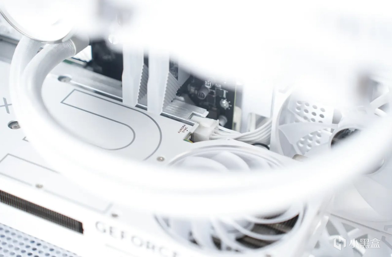 当然,个人最喜欢的一点还有它的隐藏式走线设计。该显卡采用了8pin供电,与ARGB灯光同步的接口都被放置在显卡底部(与PCIe插槽同一面),最关键的是还搭载了一个磁吸的挡板,完整安装后线材可以完美的消失。