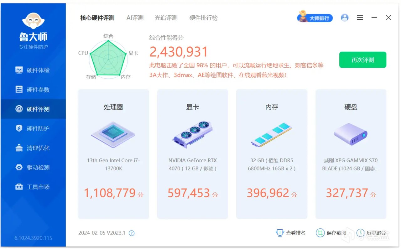性能测试环节先来看看喜闻乐见的鲁大师,总分为2430931,其中处理器得分为1108779,显卡的得分为597453,内存得分为396962,硬盘得分为327737。