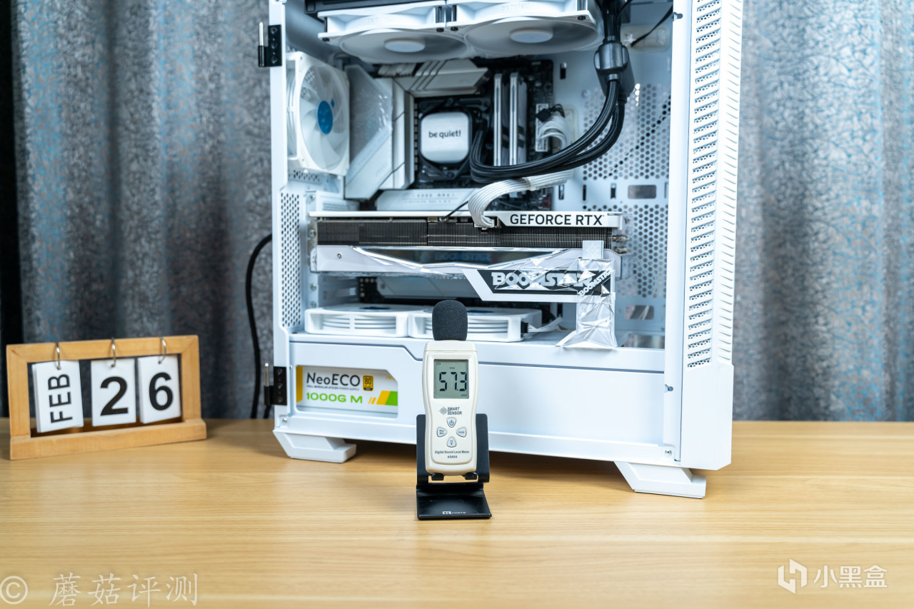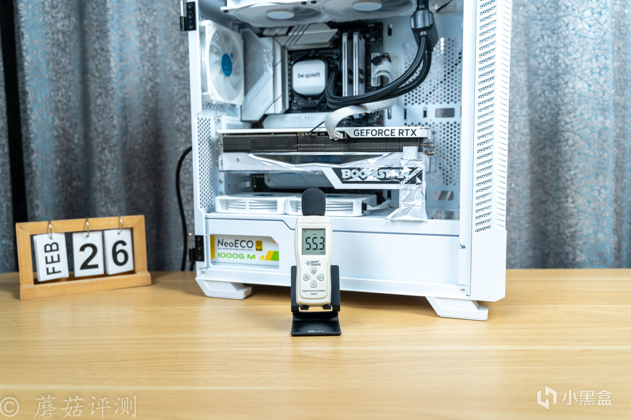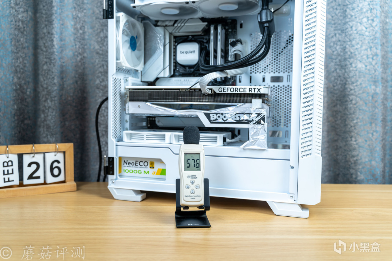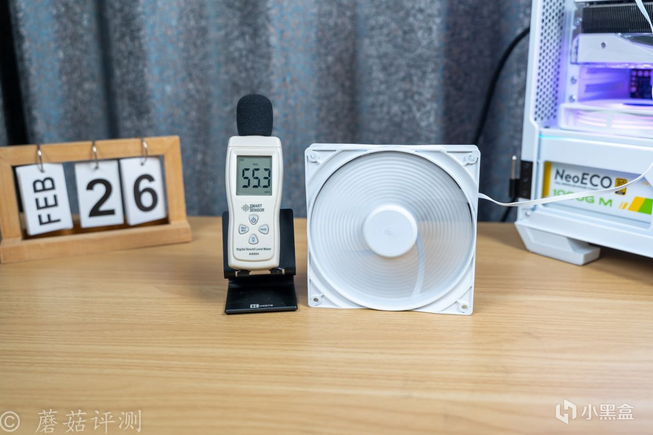▼日常待机情况,停转机箱其他风扇,待机噪音表现在55.3dB左右,搭配原装风扇,噪音表现得去到56dB左右。旁边有两盏LED灯,灯的散热风扇挺吵的,环境噪音大约得53dB左右。不过,就主观的听感来说,几乎听不到冷排风扇转动的声音。