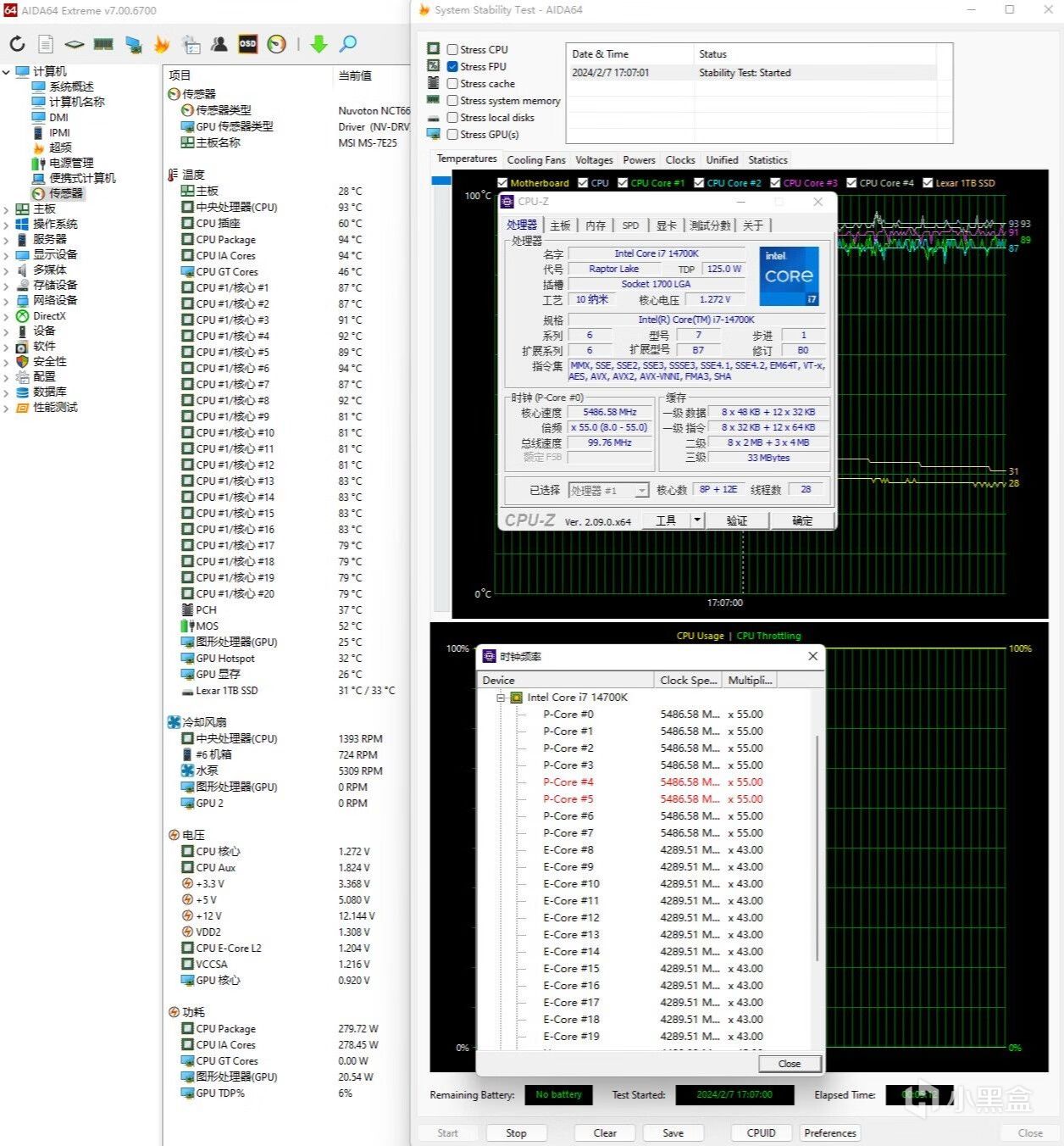 ▼单烤FPU测试,处理器功耗在280W左右,大核心睿频5.5GHz,小核心睿频4.3GHz,温度在93℃左右,可以稳稳的压住。搭配原装风扇的话,大概的温度也得在93℃左右,德商德静界这款Pure Loop 2 FX 280一体式水冷的散热性能表现非常不错。