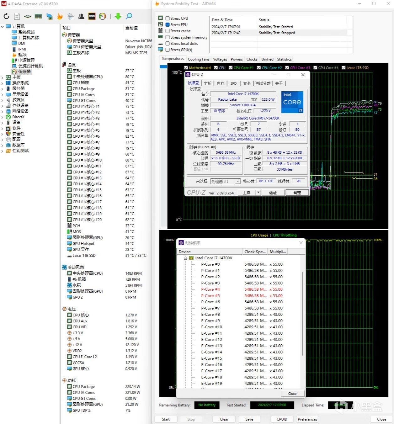 ▼跑个CPU-Z的压力测试,处理器功耗在225W左右,大核心睿频5.5GHz,小核心睿频4.3GHz,温度在80℃左右。搭配原装风扇,同样测试的温度要略高一点,在81、82℃左右。
