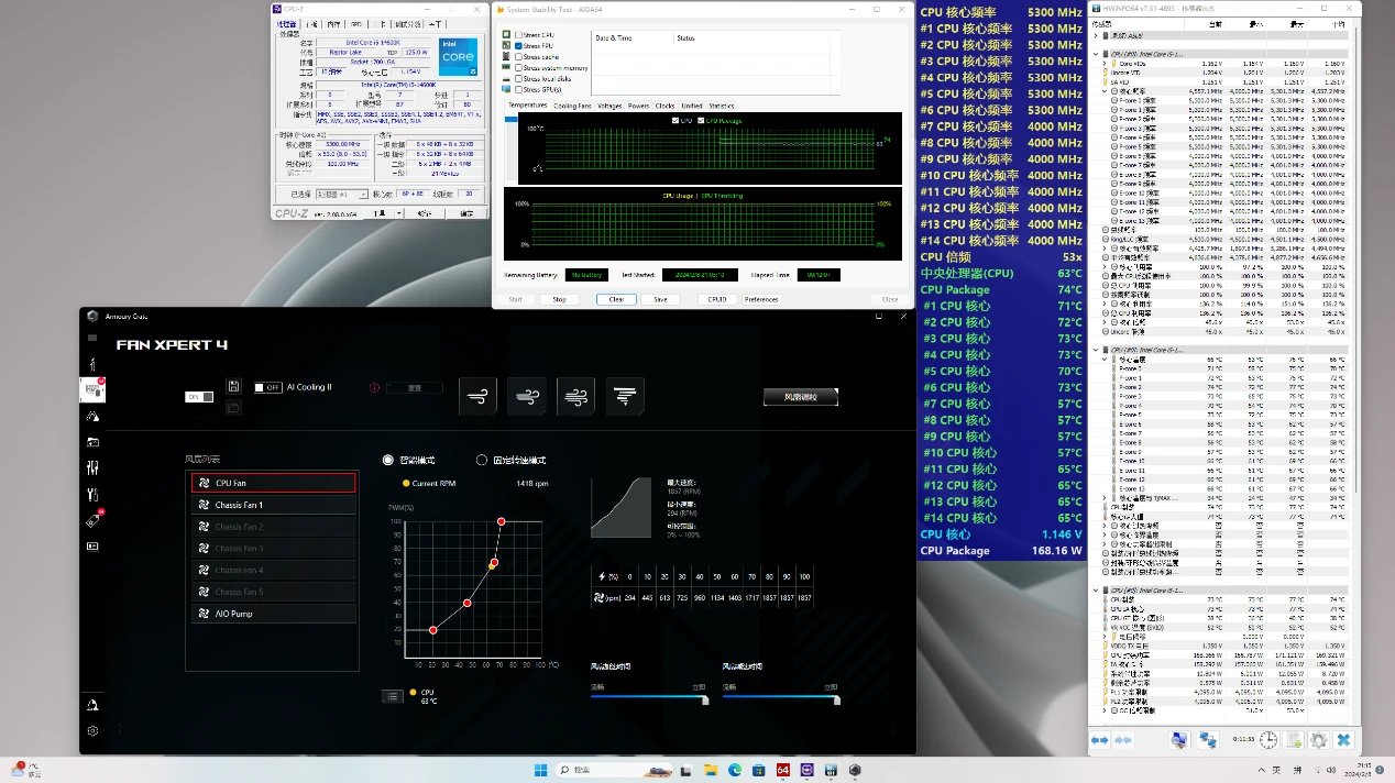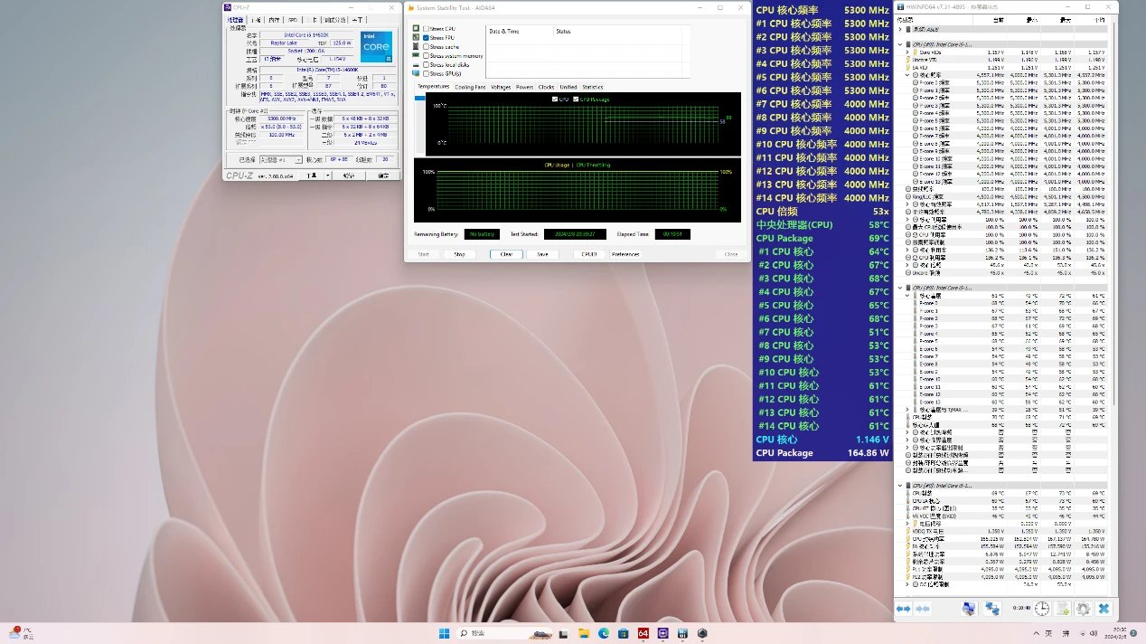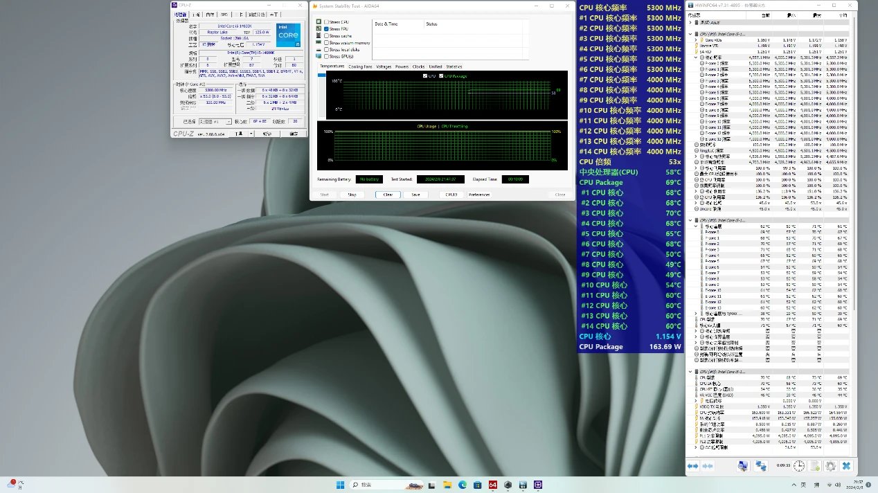把风扇转速设为全速2500RPM,在默频单烤10分钟后CPU表面温度维持在58°C;核心温度维持在69°C,最大温度为72°C,平均温度为61°C。P-Core的频率全部维持在5.3Ghz,E-Core的频率全部维持在4.0Ghz,全过程没有出现降频现象。