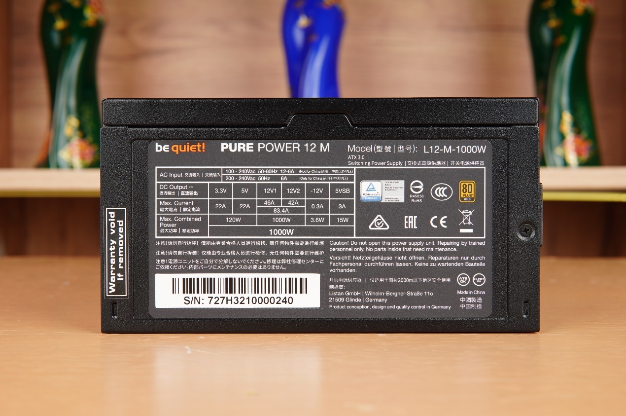 PURE POWER 12 M 1000W内部结构是全桥LLC谐振+主动式FPC+同步整流+DC-DC,采用了双路+12V输出设计,总输出电流可以达到83.4A,可以完整输出1000W的功率,同时能够轻松处理超过其额定功率3倍的功率偏移,用来应付上述的配置是完全足够的。
