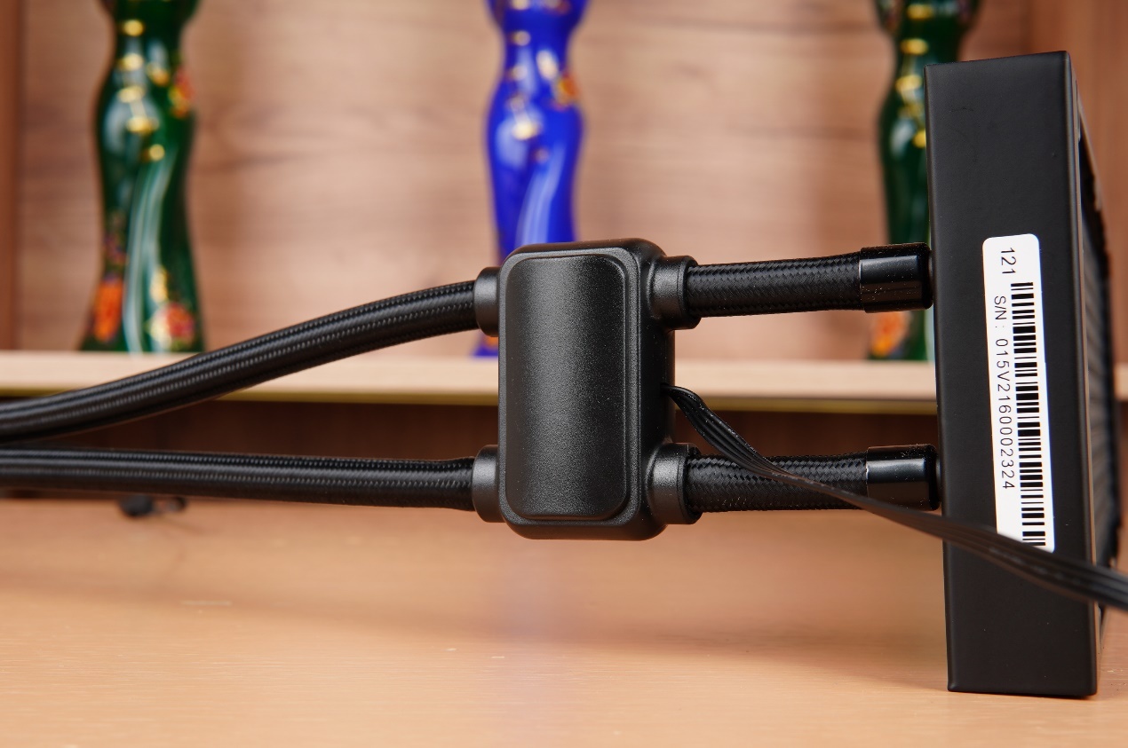 PURE LOOP 2 FX 360的水泵依然是延续了旧款的设计安放在了水冷管上,这款分离式水泵转速高达5500RPM,这是由于体积上的缩小需要高转速来保证流量,这款水泵还采用了双重减震设计,实际的噪音效果大家可以完全放心,这款水泵和风扇一样耳朵不贴上根本感觉不到噪音,同时也升级到了支持PWM调速。
