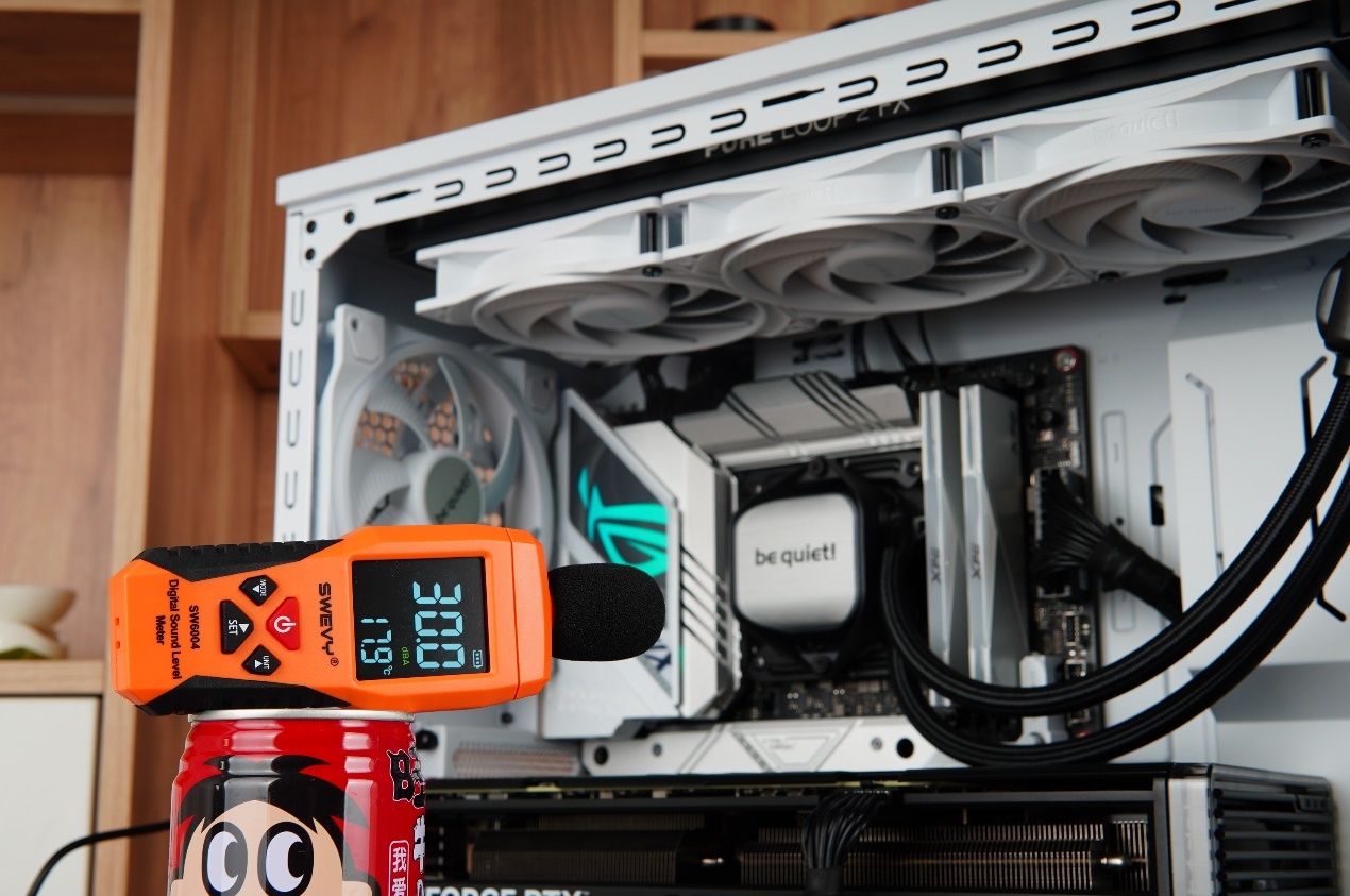在把PURE WINGS 3 PWM 120mm high-speed风扇拉至以默认PWM温度曲线进行烤机满速,并将其他机箱风扇拉至最低转速,此时测的的噪音值为35.1dBA,相较于关机时候仅略微增加5.1dBA,几乎可以忽略不计,此时的风扇噪音几乎融合在背景噪音里面,非常的安静。
