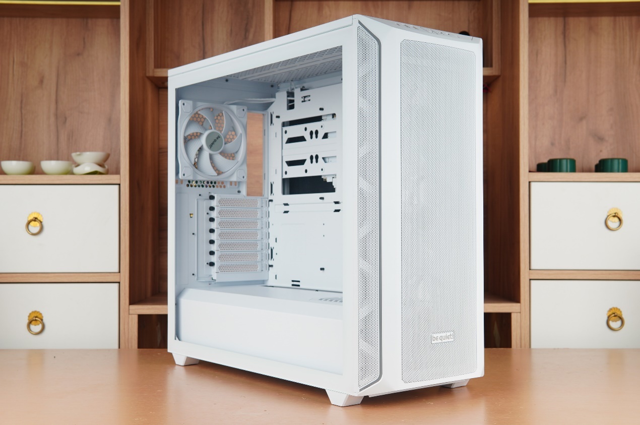 机箱方面搭配的是德商德静界最新推出的SHADOW BASE 800 FX,在外形设计方面继承了家族式的倒三角前面板设计,整体依然是以简约的北欧风格为主,让人能够通过其两侧的弧度来一眼就可以识别出其来自德商德静界的产品。
