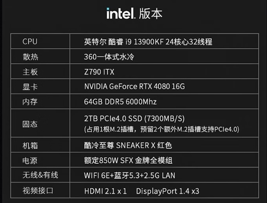 英特尔版搭载的是i9 13900KF+RTX 4080+Z790,硬盘则降到了2TB,视频输出接口为1个HDMI 2.1和3个DP 1.4接口。