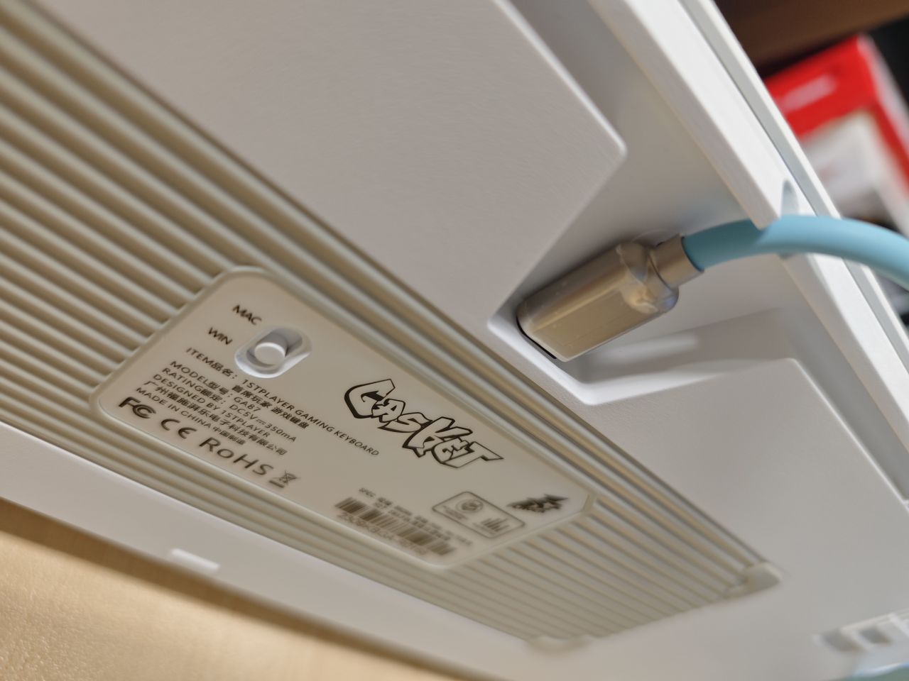 尺寸为387*140*45mm,87配列,93键。重量为1kg,整体外观主题为蓝白色。