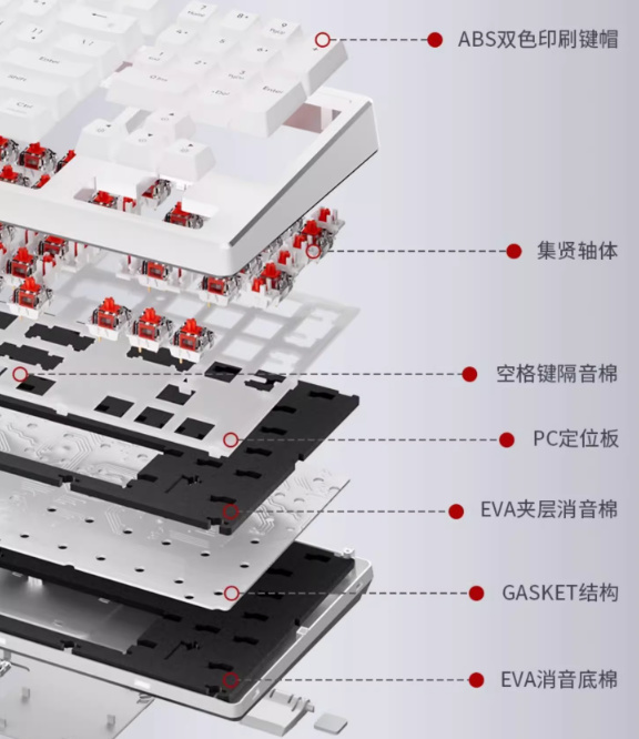 键盘采用Gasket结构, 两层EVA消音棉隔音,按键更软、声音更还原。