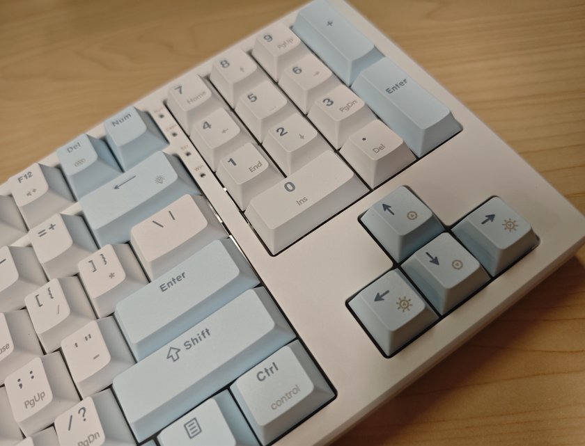 键盘虽然是87配列,但是右侧的是数字区而不是传统的功能区。功能键只留下了DEL,减小桌面的同时也更方便办公使用。