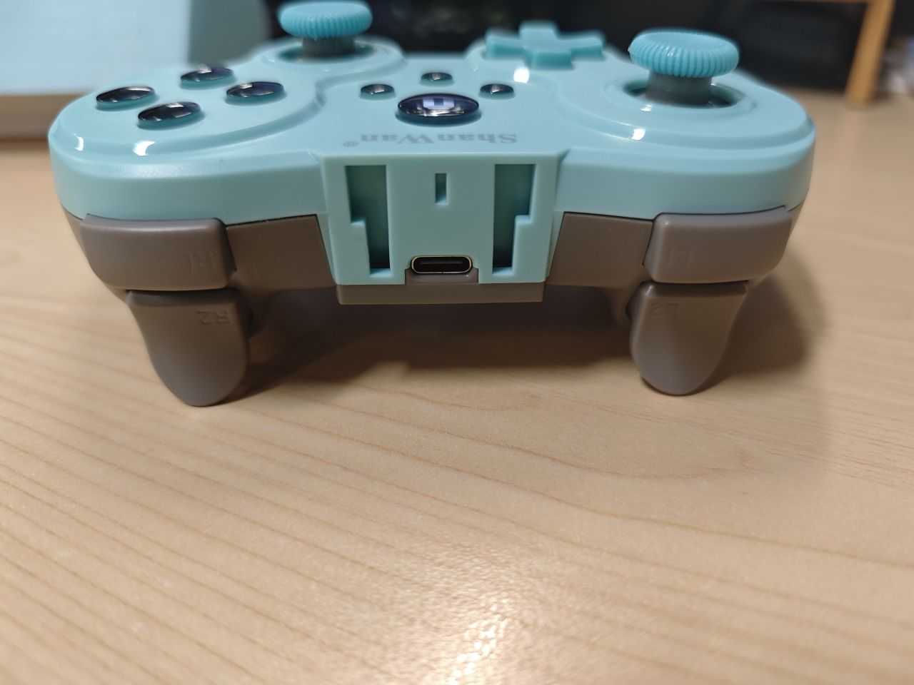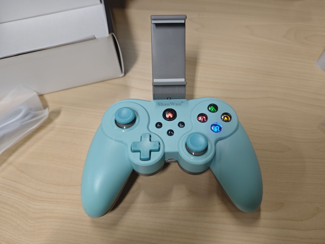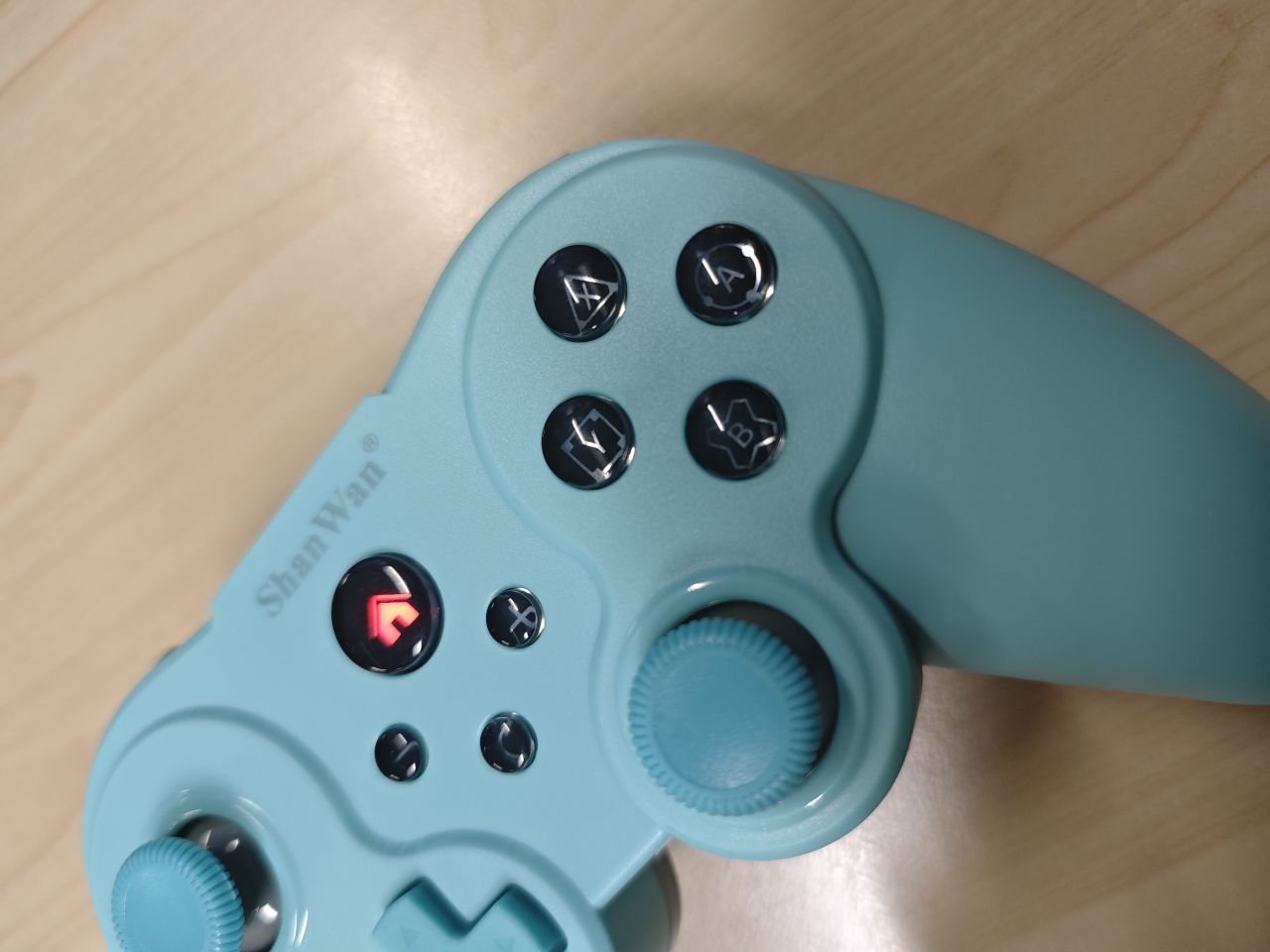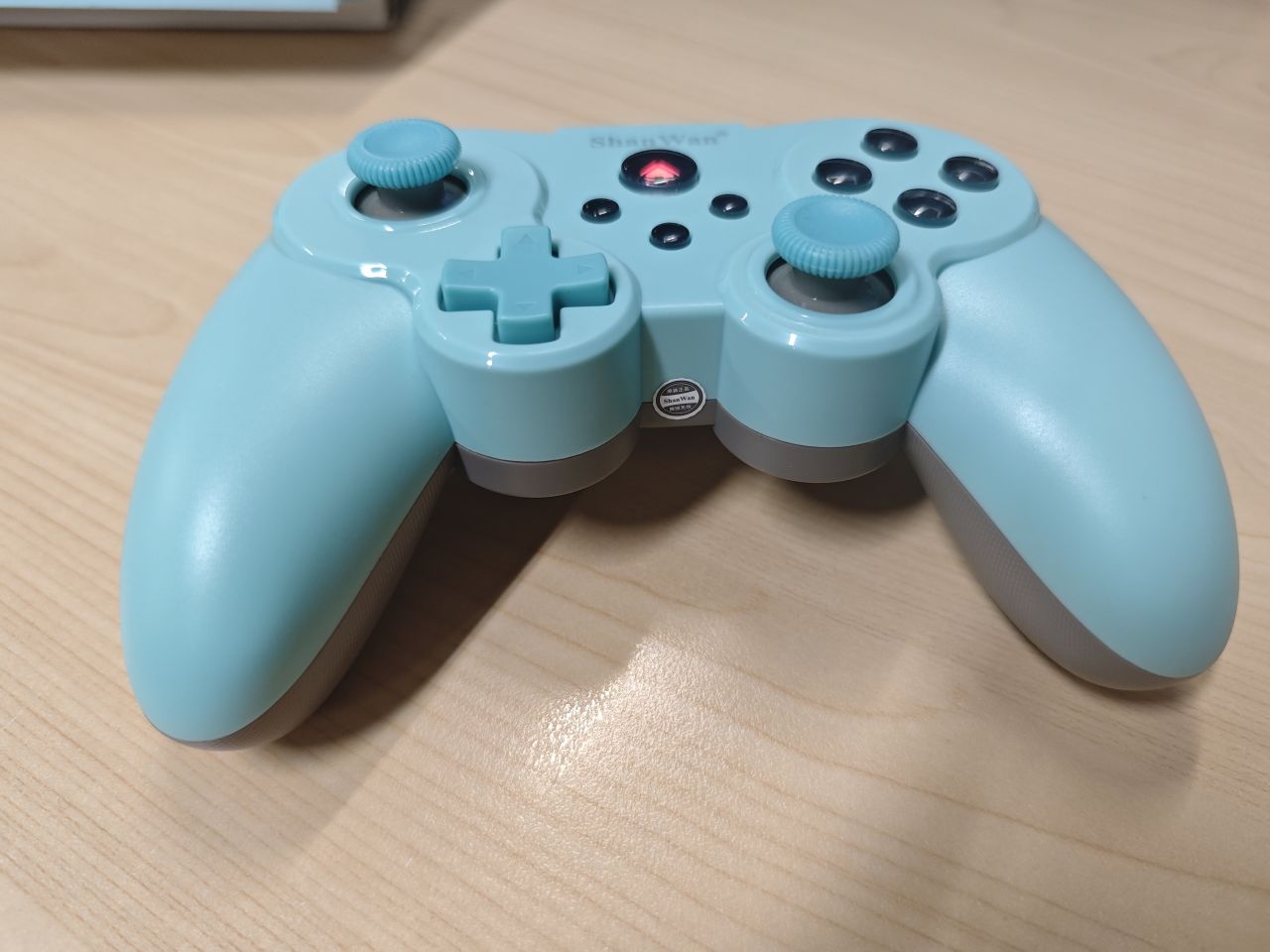 手柄有黑、白、蓝三种颜色,本次评测的是蓝色款,手柄的整体主题是蓝色的,外观上有种老式手柄的感觉。整体的塑料感很强,摸起来的感觉也比较简单。