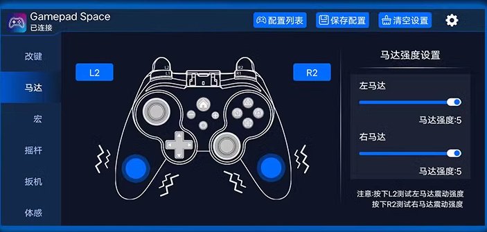 手柄是六轴体感、非对称双震动马达,可以下载Gamepad Space更改按键、马达、宏、摇杆、扳机、体感等设置。拥有超低功耗主控芯片,续航实际可达30小时。