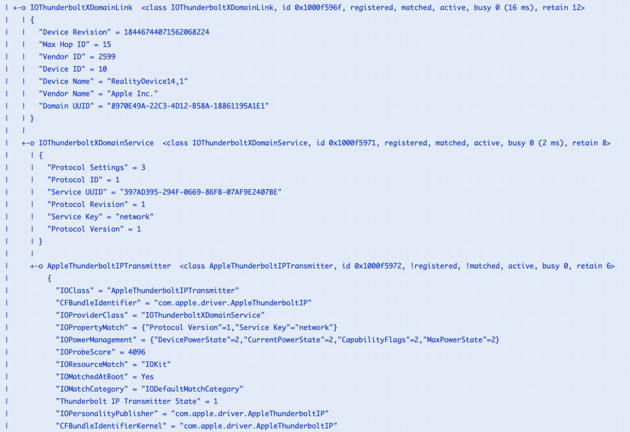 IT之家援引该媒体报道,通过 Thunderbolt 接口,可以看到 Vision Pro 头显连接 MacBook Pro 之后,出现的一些注册表项目。