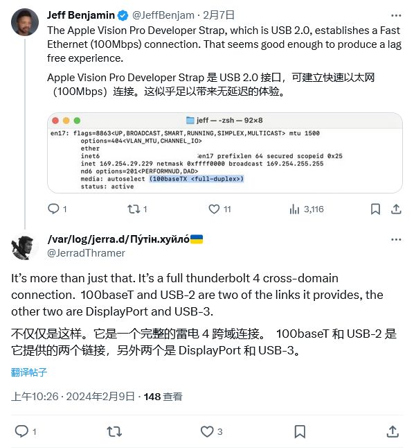 该媒体表示开发者使用这款专用的 USB-C 适配器,连接 Vision Pro 头显和 Mac 设备之后,固然可以看到限制为 480Mbps 的 USB 2.0 连接速度。