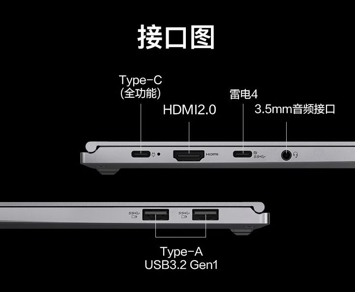接口方面,该笔记本配备 1 个雷电 4 接口、1 个“全功能”USB-C 接口、2 个 USB-A 3.2 Gen 1 接口、1 个 3.5mm 音频接口、1 个 HDMI 2.0 接口。