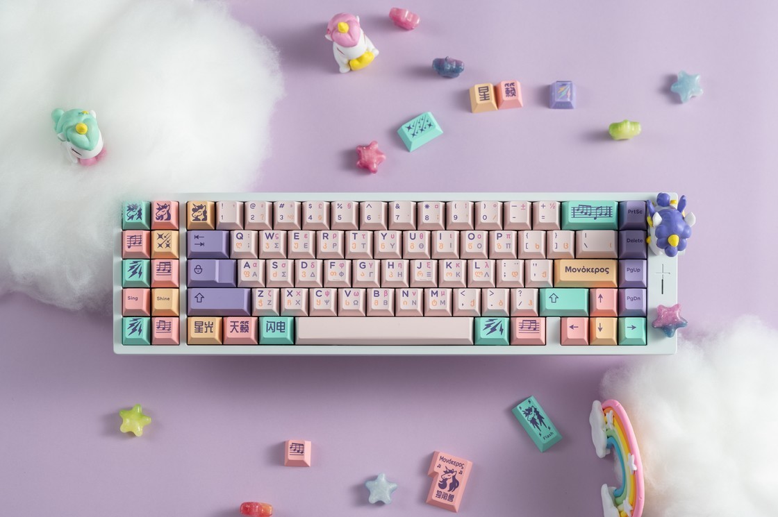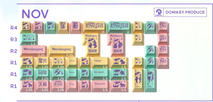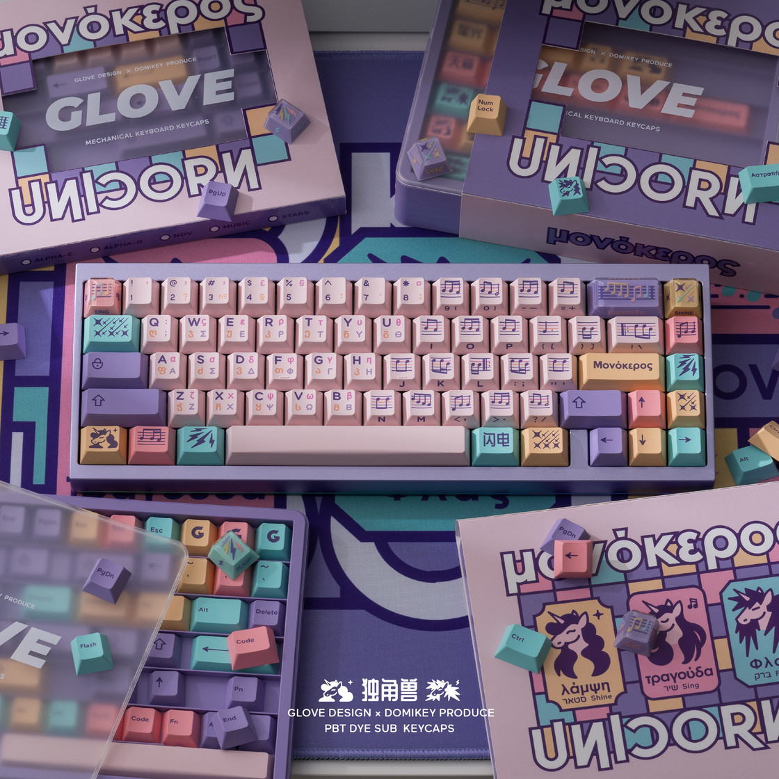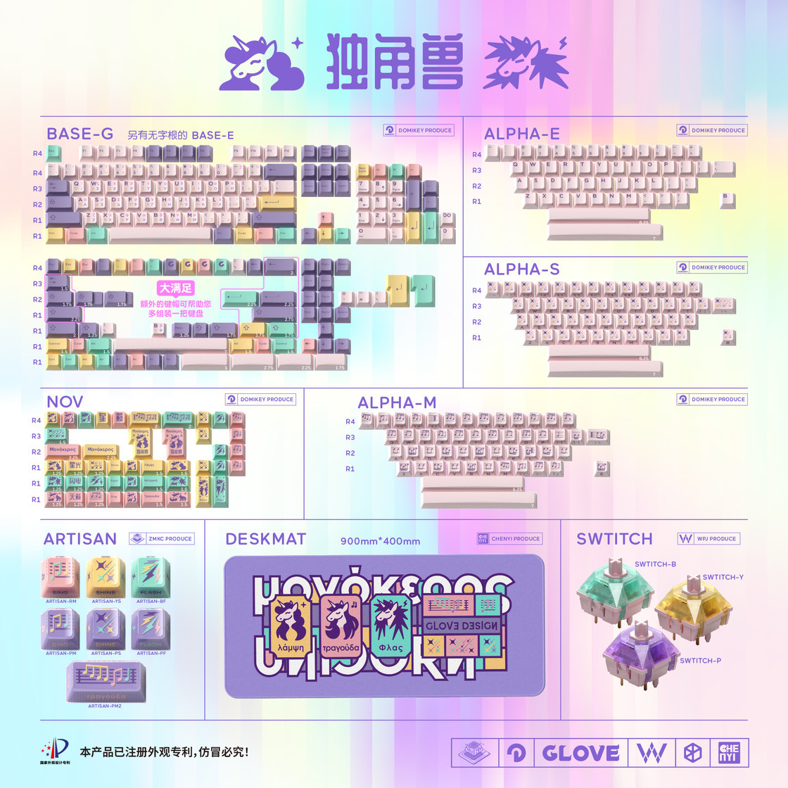 以DJ、主唱、舞者为题,配合独角兽元素进行设计,星光闪电和天籁三种图案,还附有流星alpha和五线谱alpha,五线谱应该是《阳光彩虹小白马》的曲,当然,为了保证实用性,特殊alpha采用侧刻字母设计。