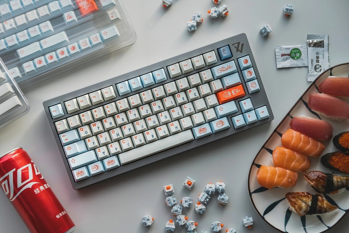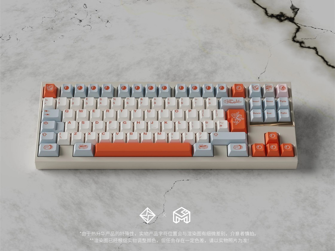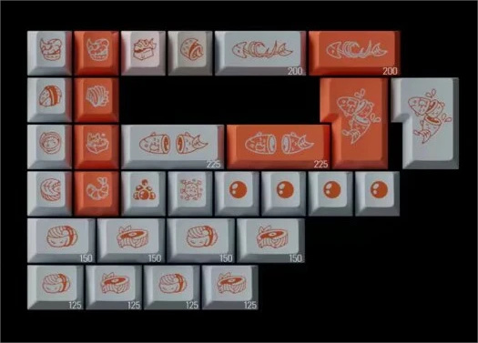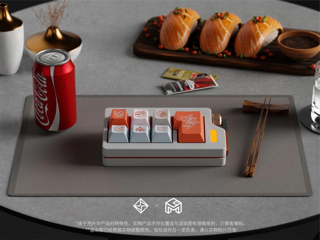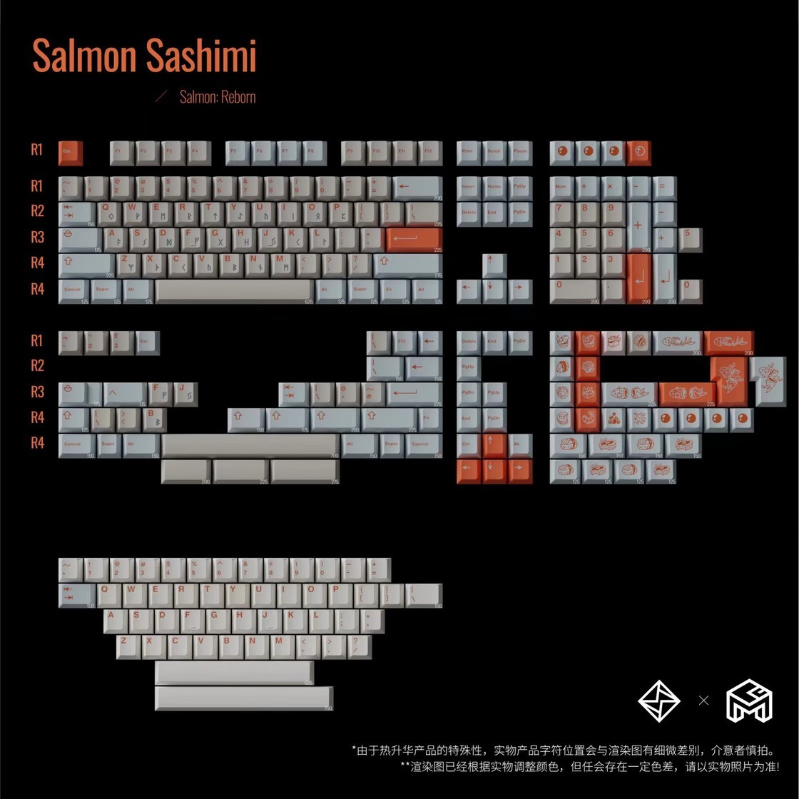 这款键帽是由Mars设计的美食主题键帽。配色灵感来源于三文鱼,个性灵感来源于三文鱼刺身和三文鱼寿司