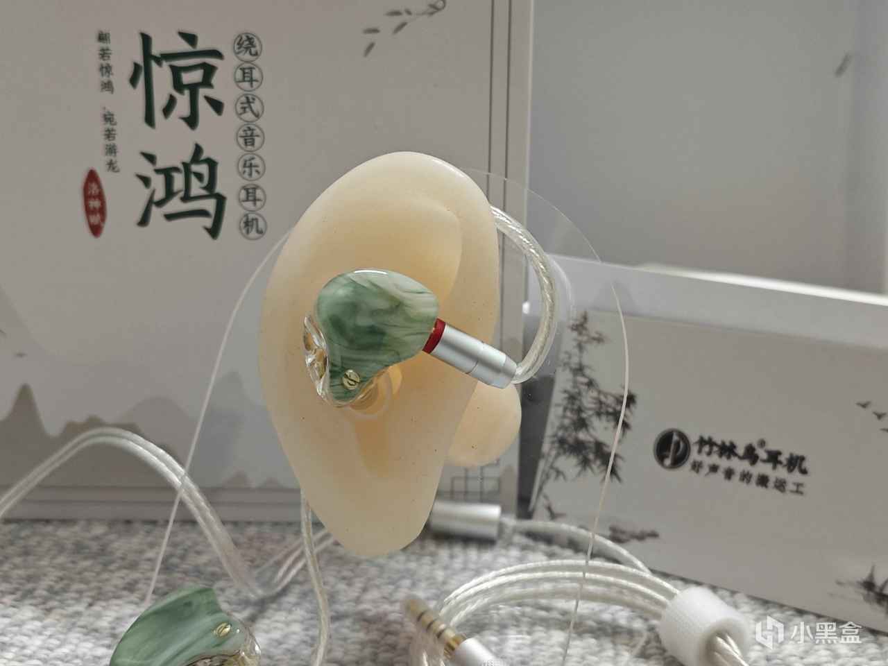 惊鸿的外观非常漂亮,腔体的正面面盖看着非常有光泽,摸起来是原石质感的,像真的玉片一样漂亮。惊鸿一共有4个颜色版本:凝霜白、浓墨黑、白+黑、翡翠。我这款是翡翠颜色。腔体背面是透明的PC材质,能看到内部的发声单元及走线,非常漂亮。