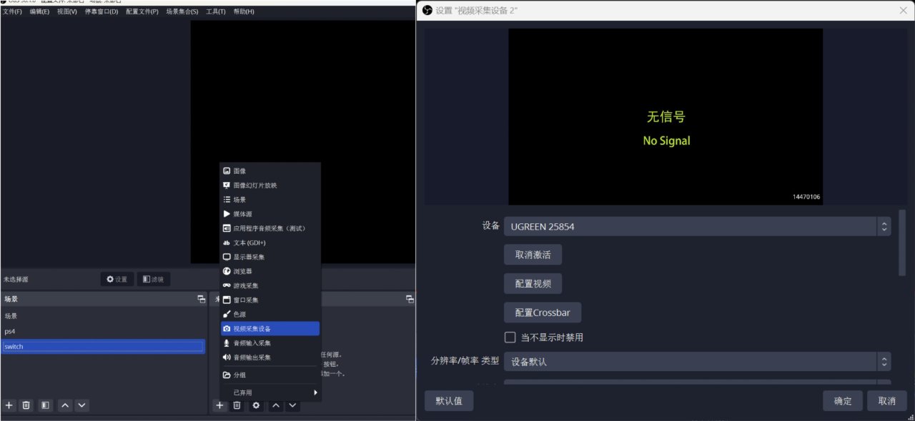 然后新建一个视频采集设备,命名就直接默认就完了,然后找到你的采集卡,一般是型号或者usb设备,我这里就直接显示了绿联25854,因为没有开机Switch,所以他这里就显示没信号
