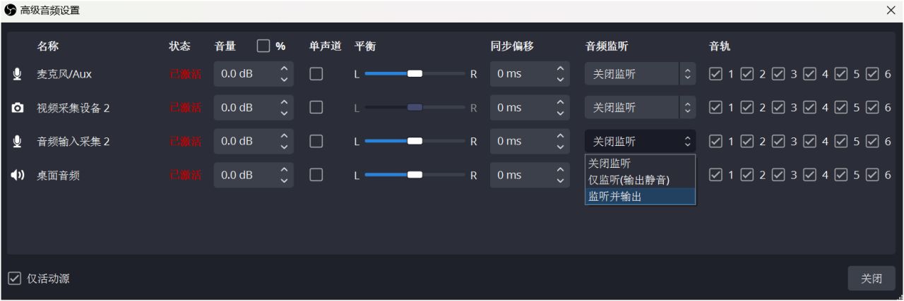 然后把音频输入采集2里的监听设置改成监听并输出,这时候游戏的声音就回来了