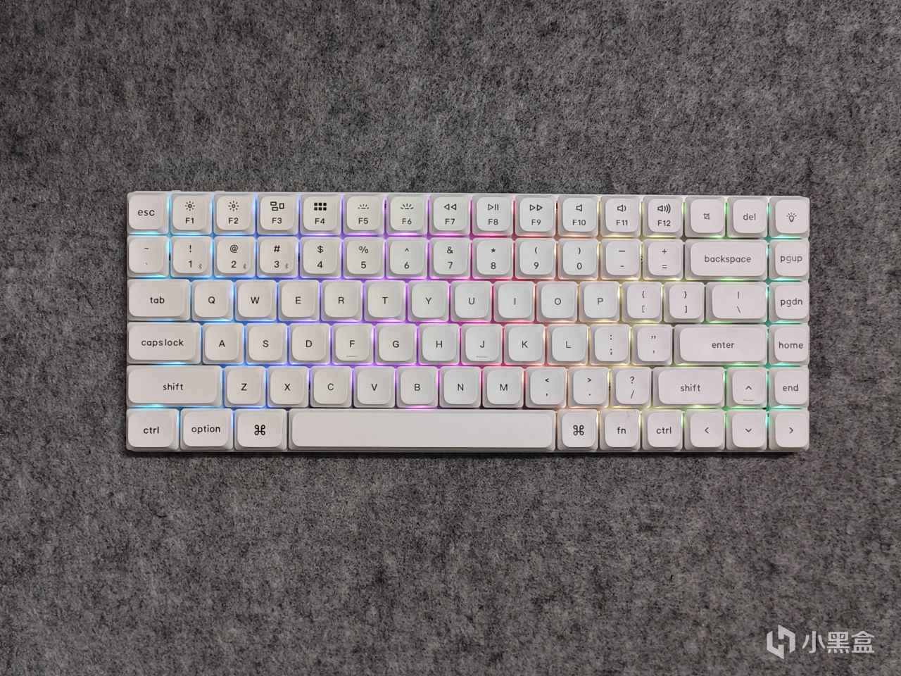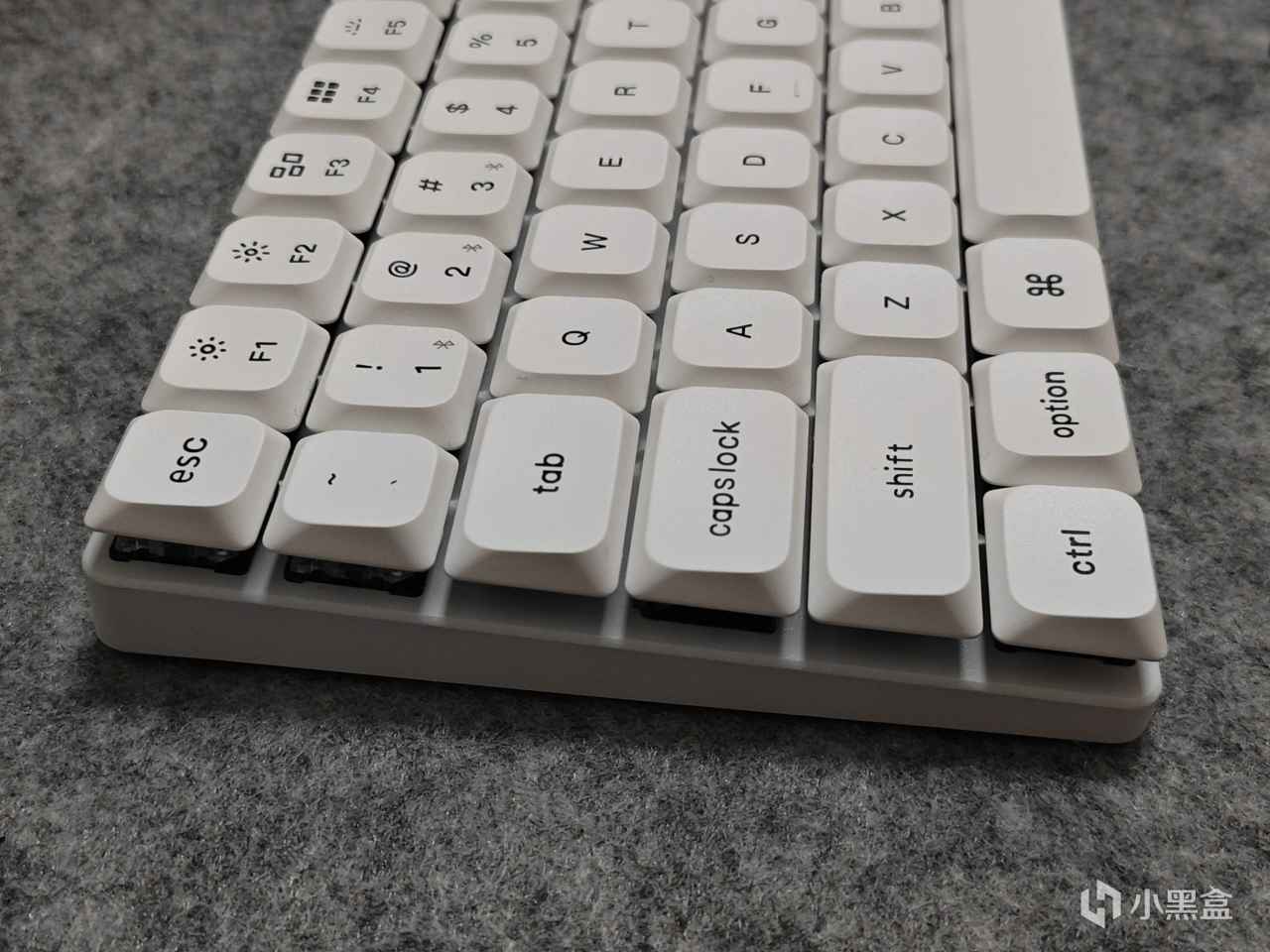 键盘机身采用高档轻盈耐摔的阳极铝材料,无边框设计。整体观感非常不错,第一眼见到非常有视觉冲击感。而且机身非常轻薄,键盘最高的地方仅为22毫米,而且重量也是仅为525g,这个大小跟重量,即便是有外出携带的需求,也是很方便的。