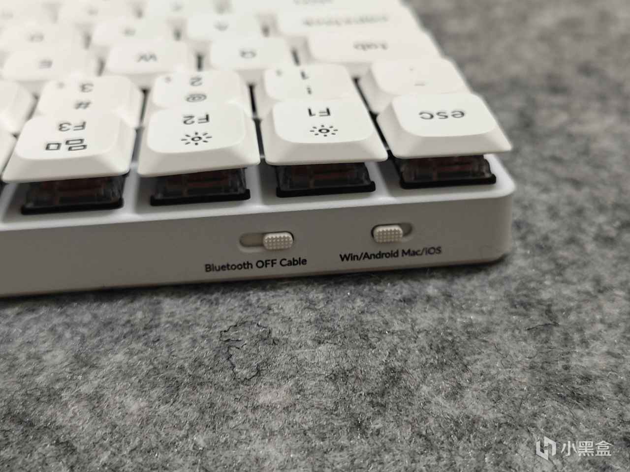 键盘的上部位置设计有一个连接模式的切换按键及一个系统切换按键,能够一键切换所需使用的系统场景,设计非常人性化。而充电口则是设计在了键盘居中的位置。