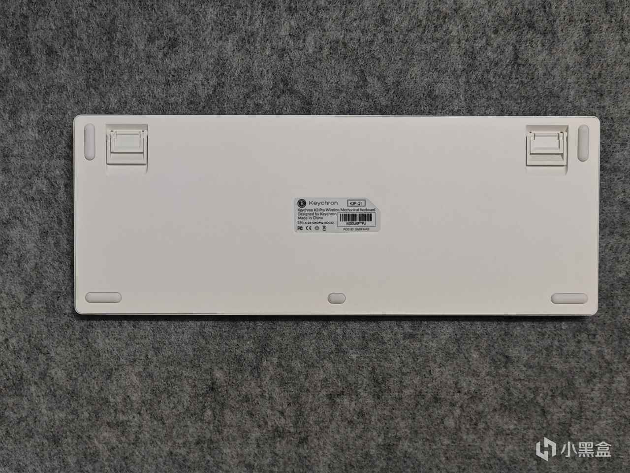 键盘的底板采用的是PC材质而非阳极氧化铝板,这是因为键盘是双模的连接方式,如果全铝机身会影响蓝牙连接的稳定性,另外也是为了轻量化考量。背板的设计非常简洁,有5处防滑脚垫,脚撑是2段式脚撑。