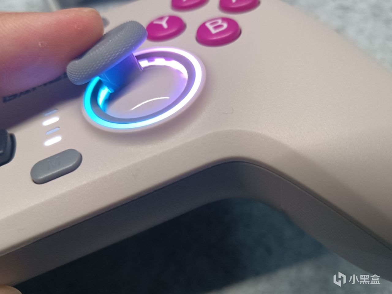 摇杆方面采用的是定制的霍尔摇杆,永不漂移,使用寿命方面会更长一点,默认有一点中心死区,也是为了防止摇杆漂移,可以通过组合键开启无死区模式,无十字吸附,外圈调教为正圆形,摇杆外圈有POM防磨环,有效减缓摇杆磨损,防磨环外侧有着一圈RGB灯带,效果很棒,灯光的灯效亮度速度方面都是可以通过组合键调节的。
