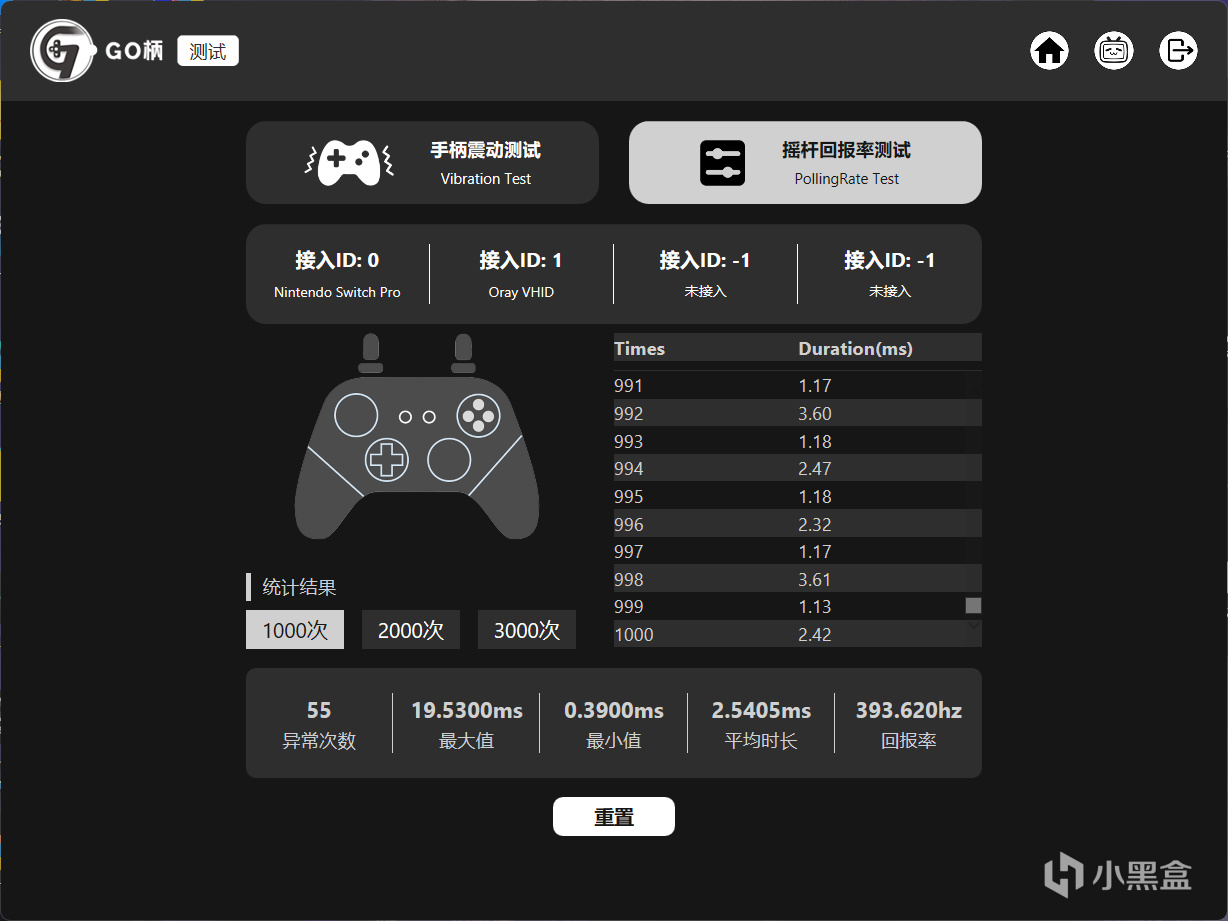 回报率方面,有线连接状态下可以做到500Hz左右的回报率,蓝牙状态下官方提供的数据是125Hz,但是本人多次测试发现普遍在380Hz左右,最高有400Hz的高回报率(截图为证),现在的很多手柄蓝牙模式下回报率普遍在200以内,这次启明星NS的蓝牙回报率可以说是非常高的水平了,因为没有2.4G接收器,所以2.4G就没有测试。